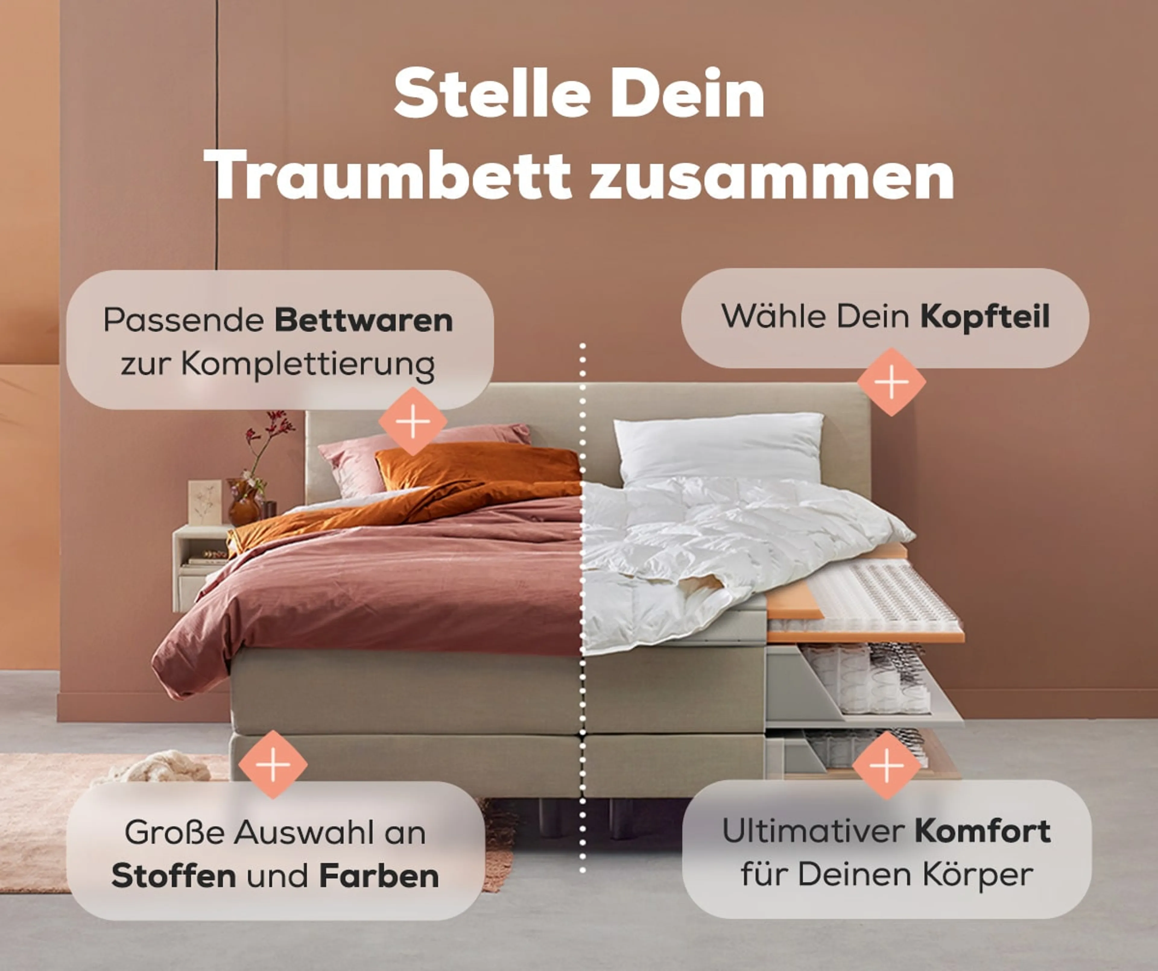 Die Lieferzeit hängt von Deiner Bettenwahl ab. Wir haben ein paar beliebte Boxspringbetten-Konfigurationen vorrätig, sodass diese schon innerhalb von 1-4 Wochen bei Dir sind. Wenn Du schnell ein Bett brauchst, schaust Du Dir am besten unsere schnell lieferbaren Boxspringbetten an.