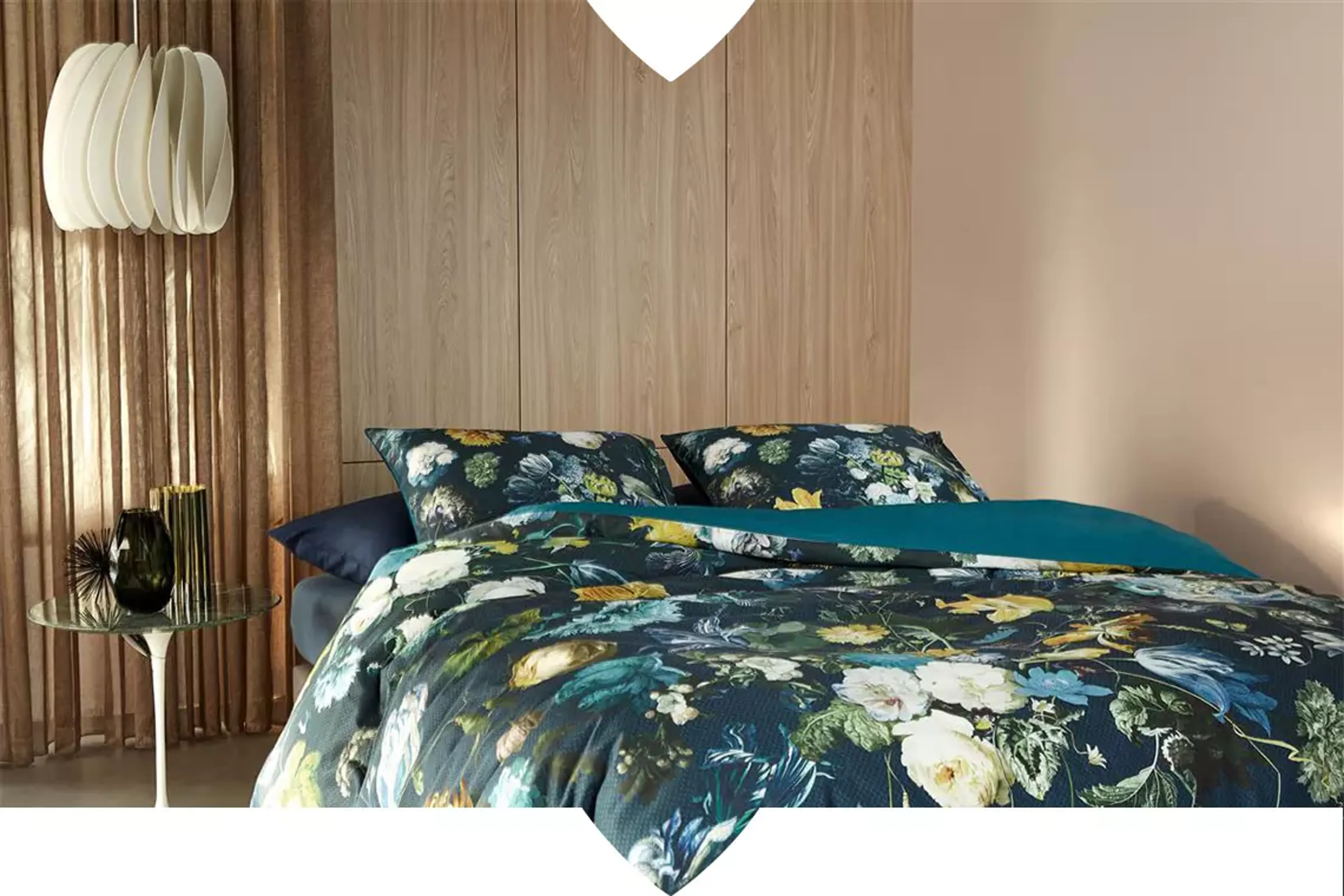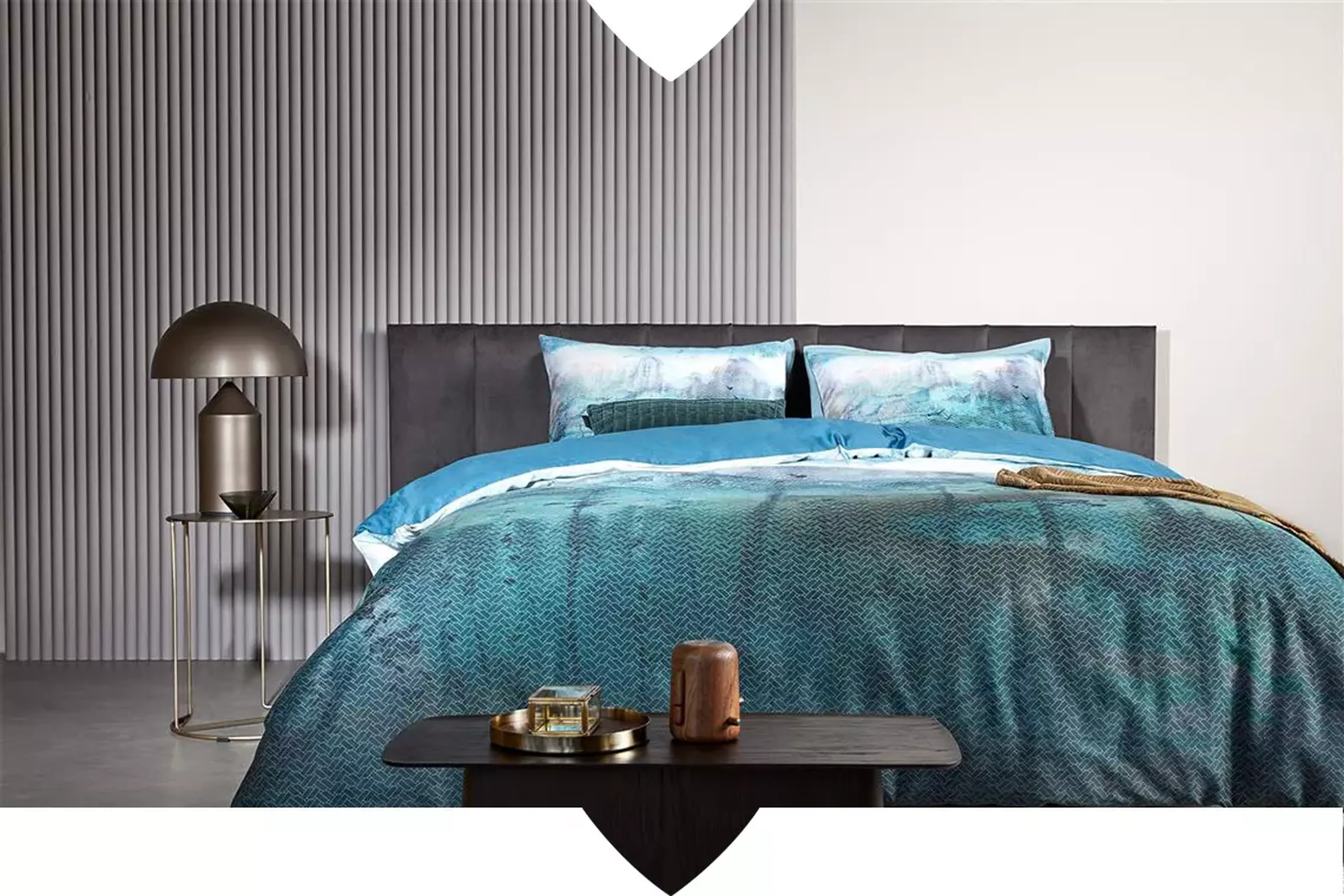 Ein modernes, cleanes Schlafzimmer sollte man einfach halten. Zu viel Schnickschnack hat hier keinen Platz, man setzt am besten auf größere Eyecatcher, wie eine stylishe Lampe oder ein auffallendes Accessoire. So wie hier im Bild mit Bettbezug Epiphany.