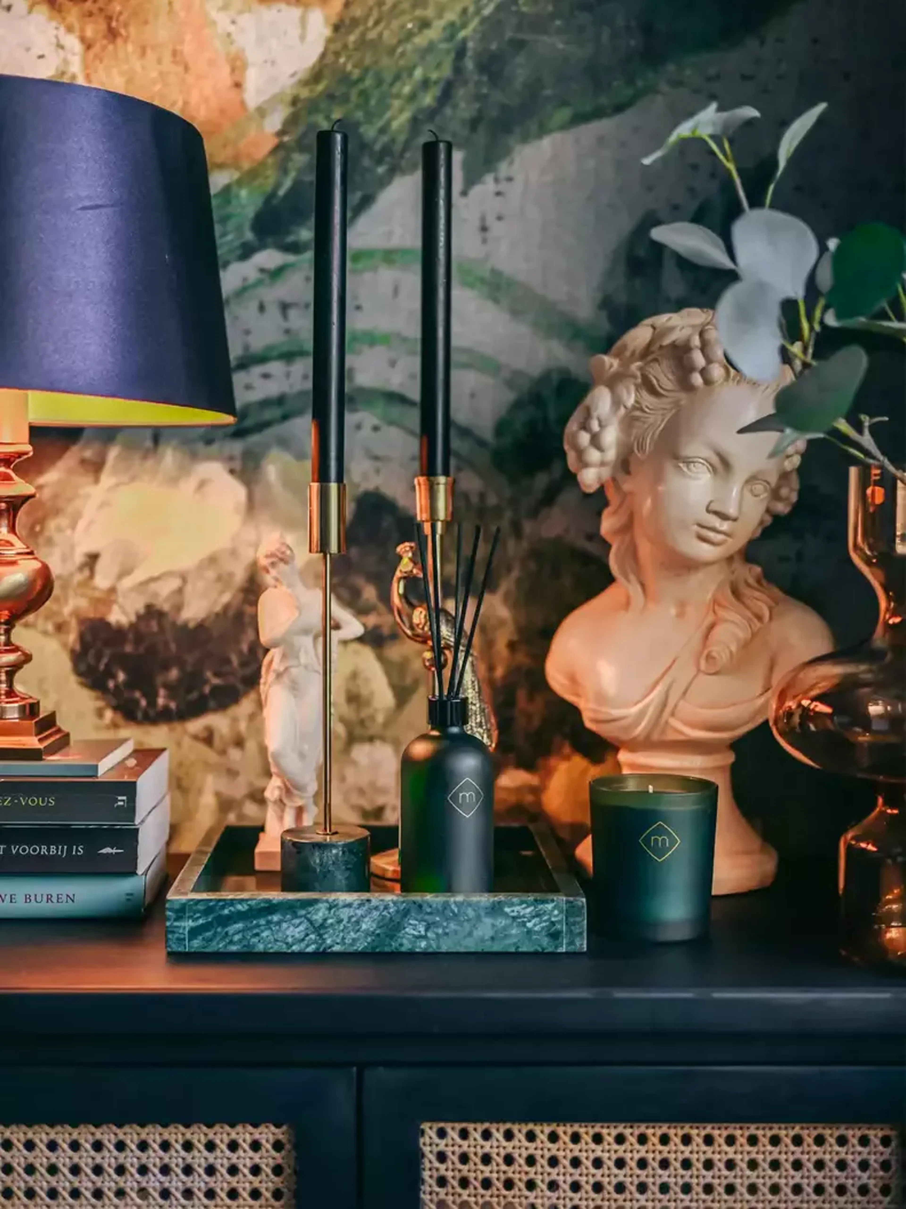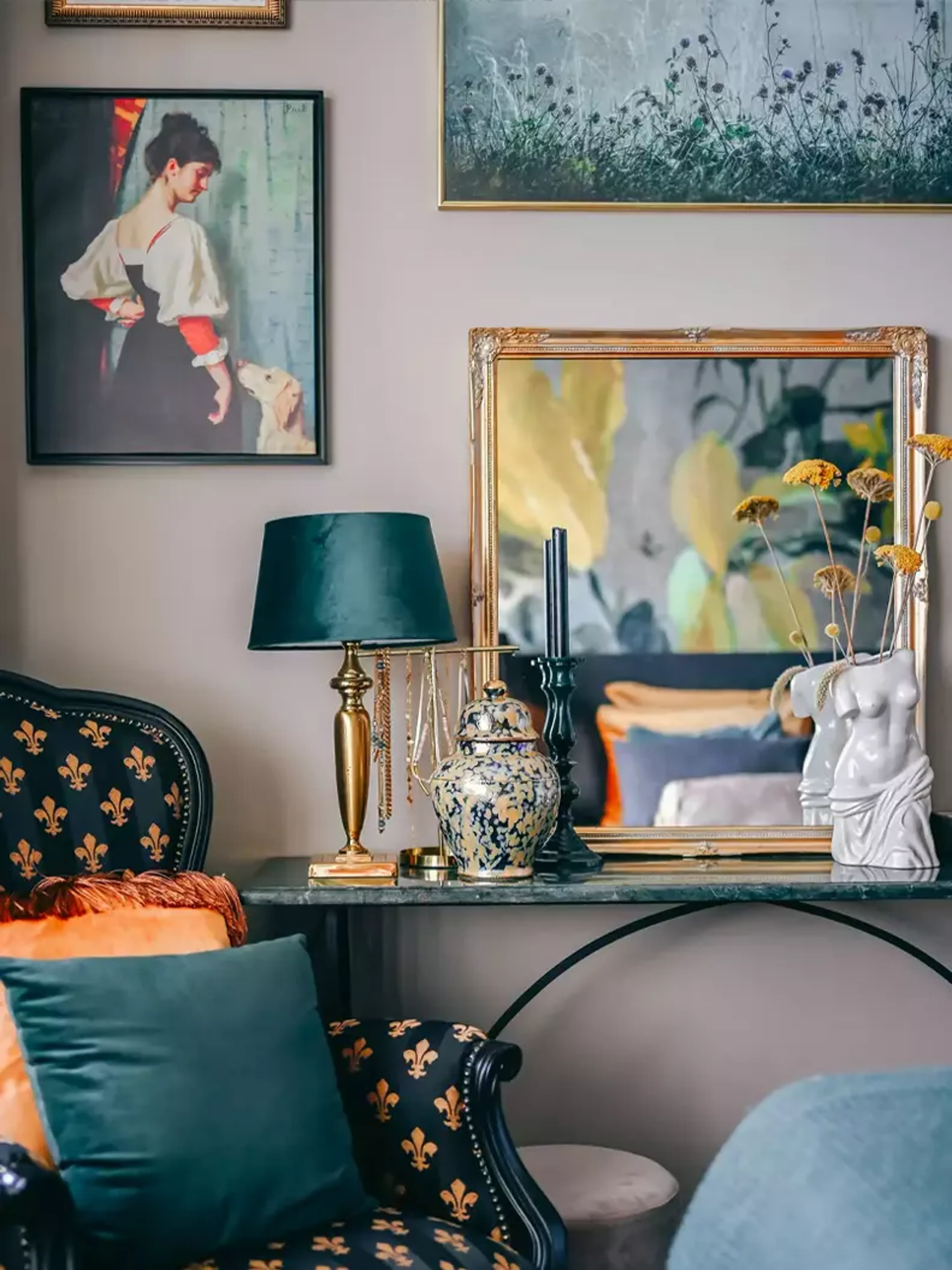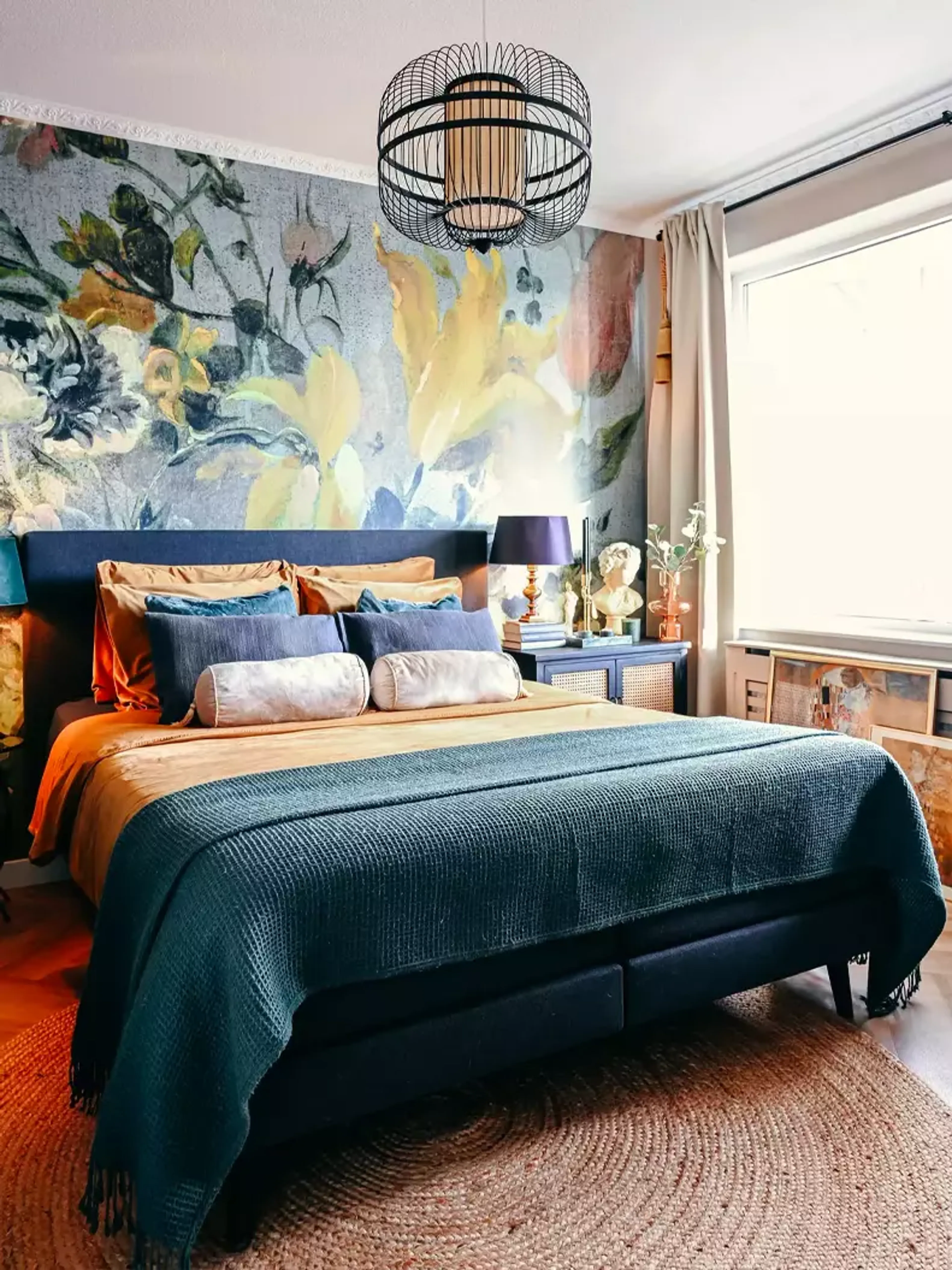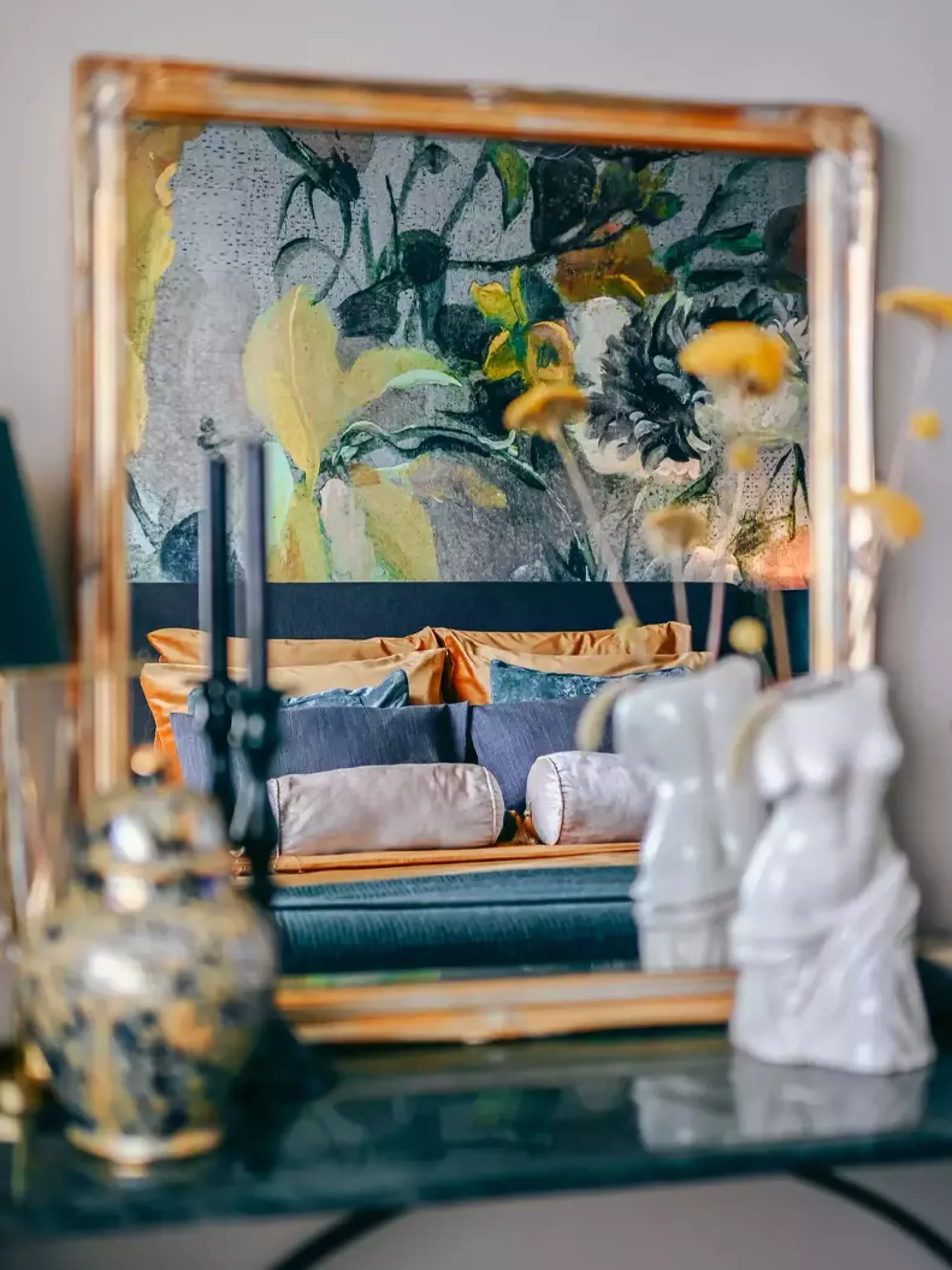 Beim Betreten von Katjas Schlafzimmer fällt als Erstes die stilvolle Blumentapete ins Auge – davor steht ihr Boxspringbett mit Zierkissen und Tagesdecke in passenden Farbtönen. Die warmen Farben von Grün über Ocker bis Gelb, kombiniert mit hochwertigen Materialien wie Velvet und Marmor, verleihen dem Raum einen luxuriösen, aber dennoch geborgenen Flair. „Ich liebe es, wenn meine Inneneinrichtung anders ist als bei anderen – ich denke, ihr wisst, was ich meine. Dafür nutze ich antike Accessoires und Schmuckstücke aus Secondhandläden.“