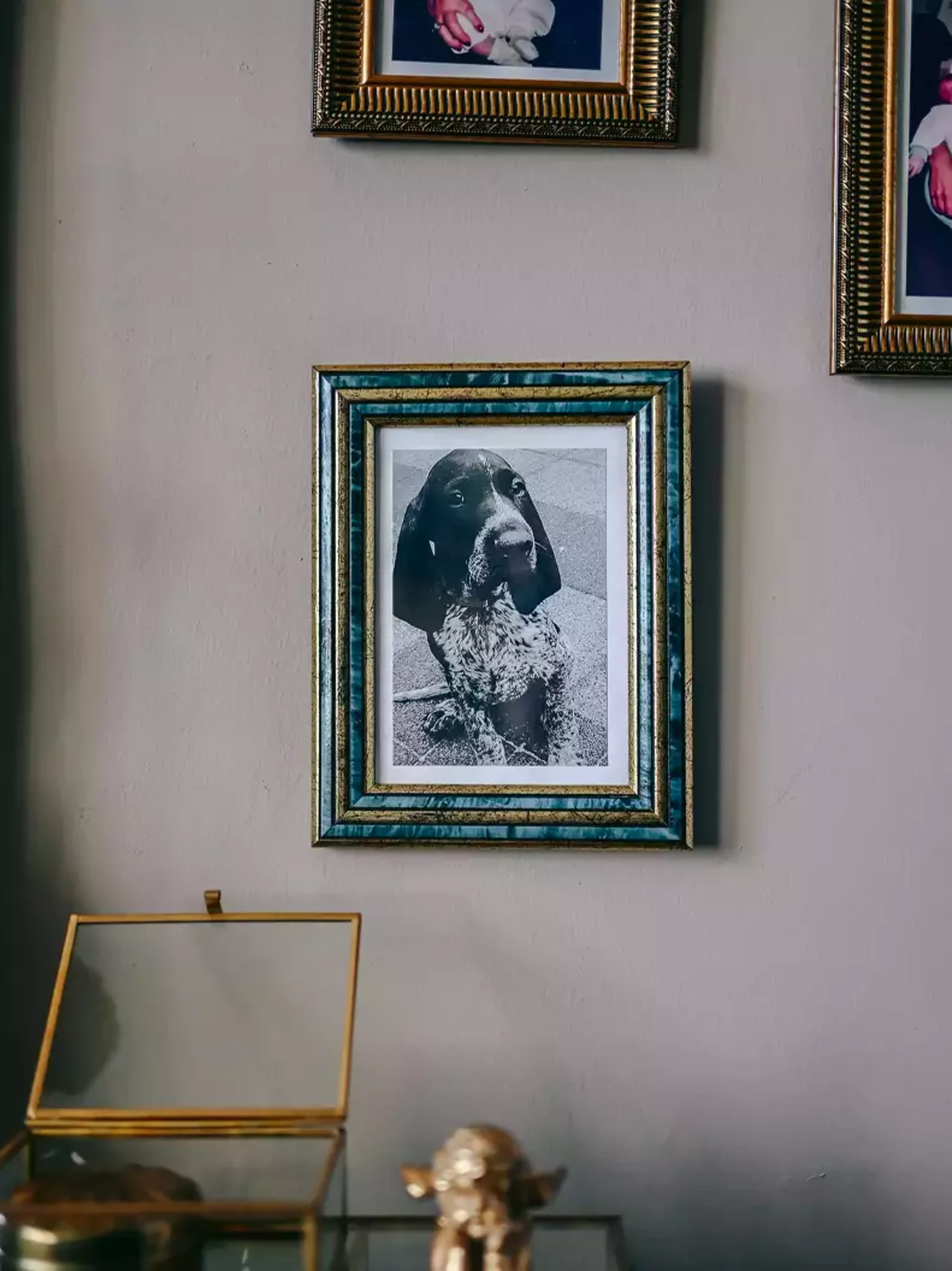 Ich liebe warmes, gemütliches Interieur – vor allem im Schlafzimmer. Gerne gepaart mit persönlichen Gegenständen.“ Deshalb darf auch ein Welpenfoto ihres Hundes Bommel an der Wand nicht fehlen. „Eigentlich darf Bommel hier nicht schlafen. Sein Foto an der Wand nimmt er aber immer wieder zum Anlass, sich unter der Kommode zu verstecken.“