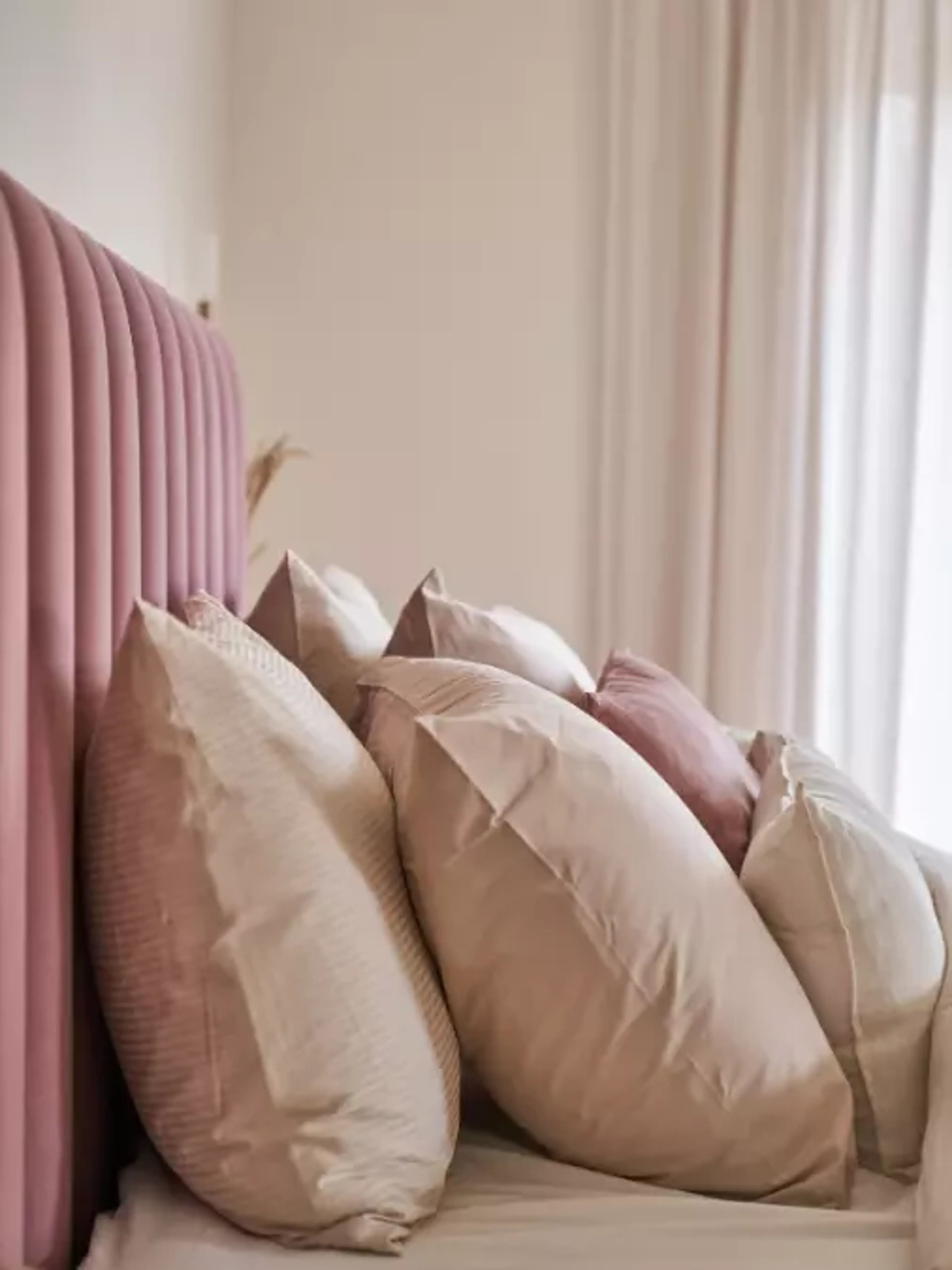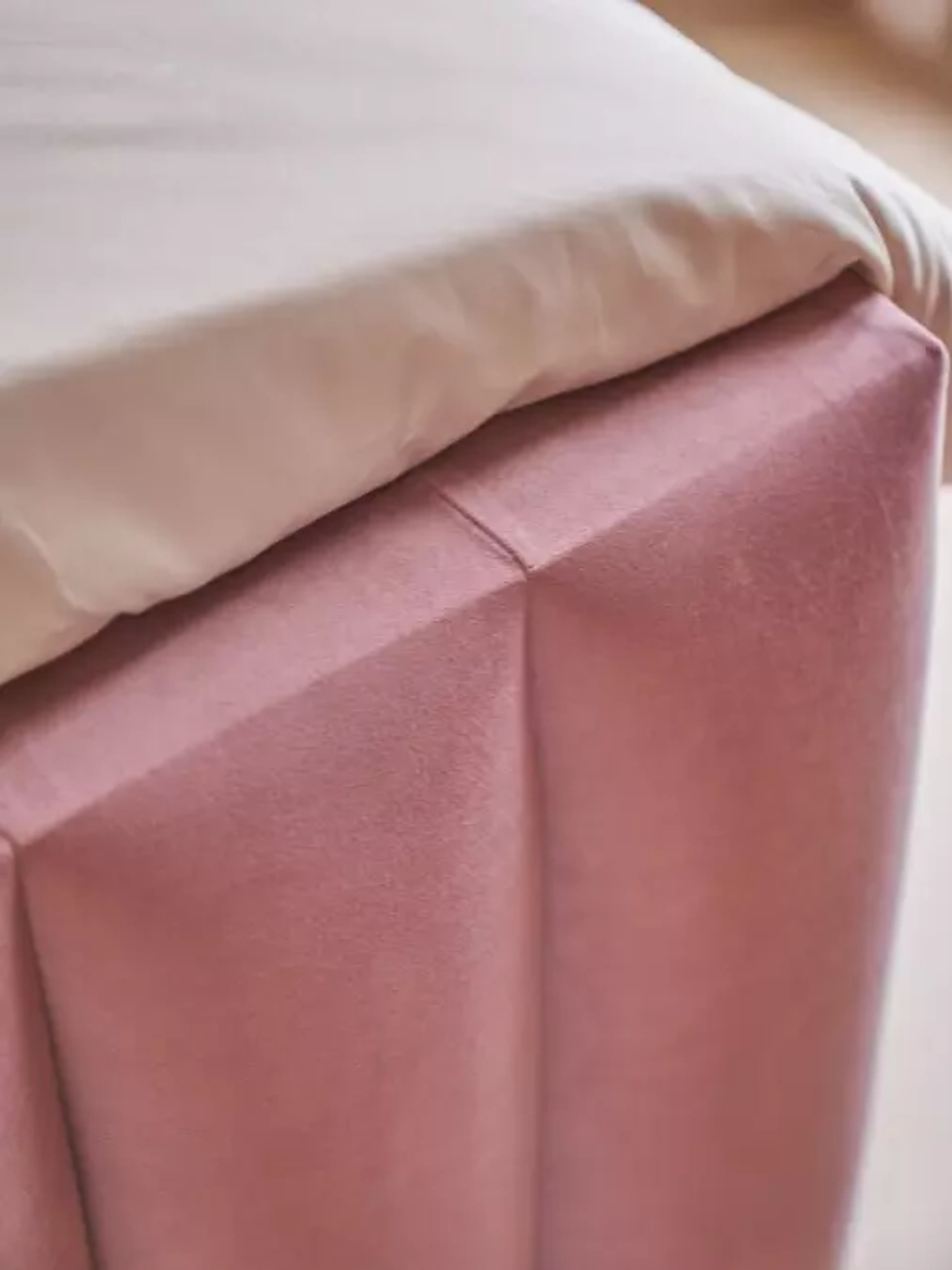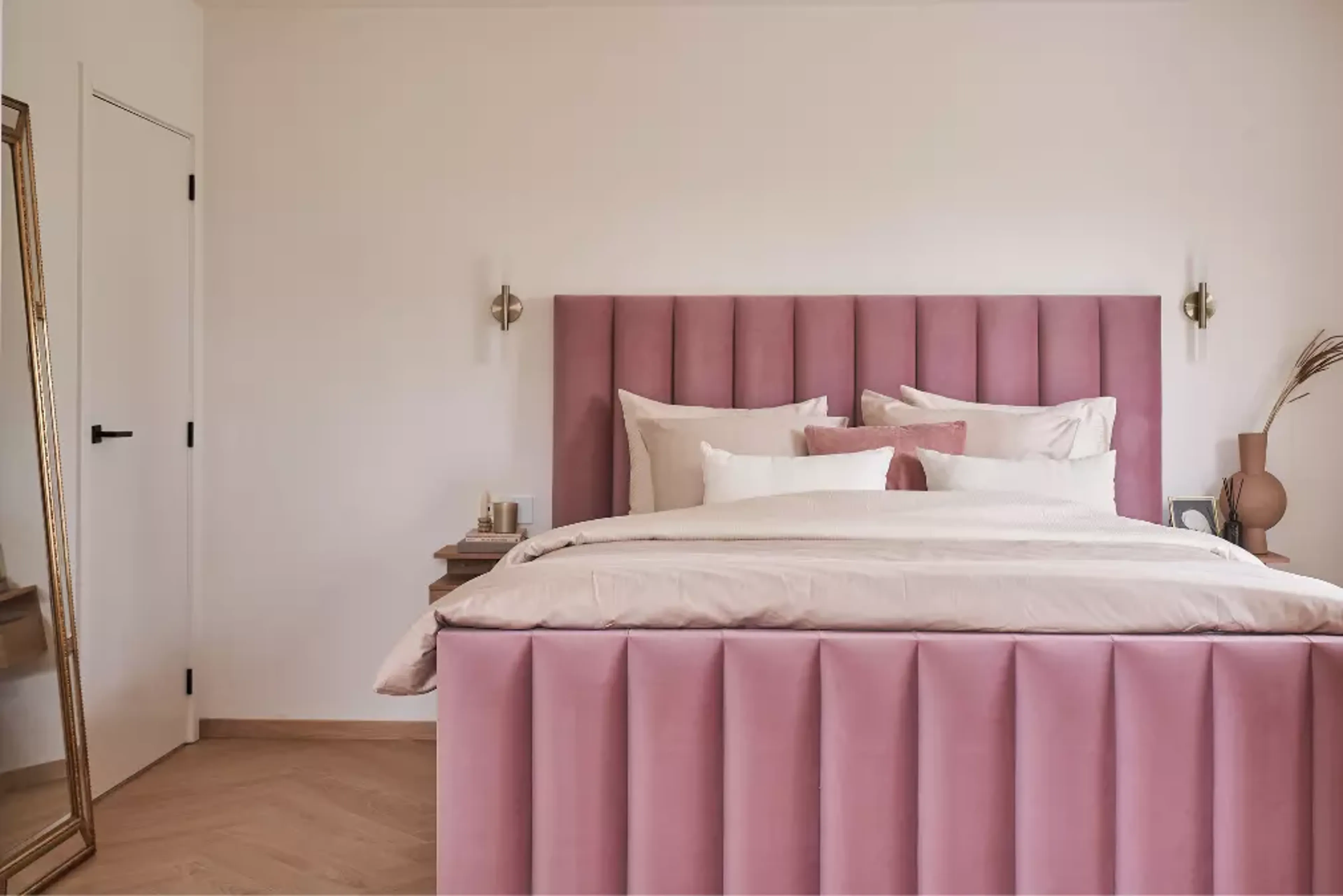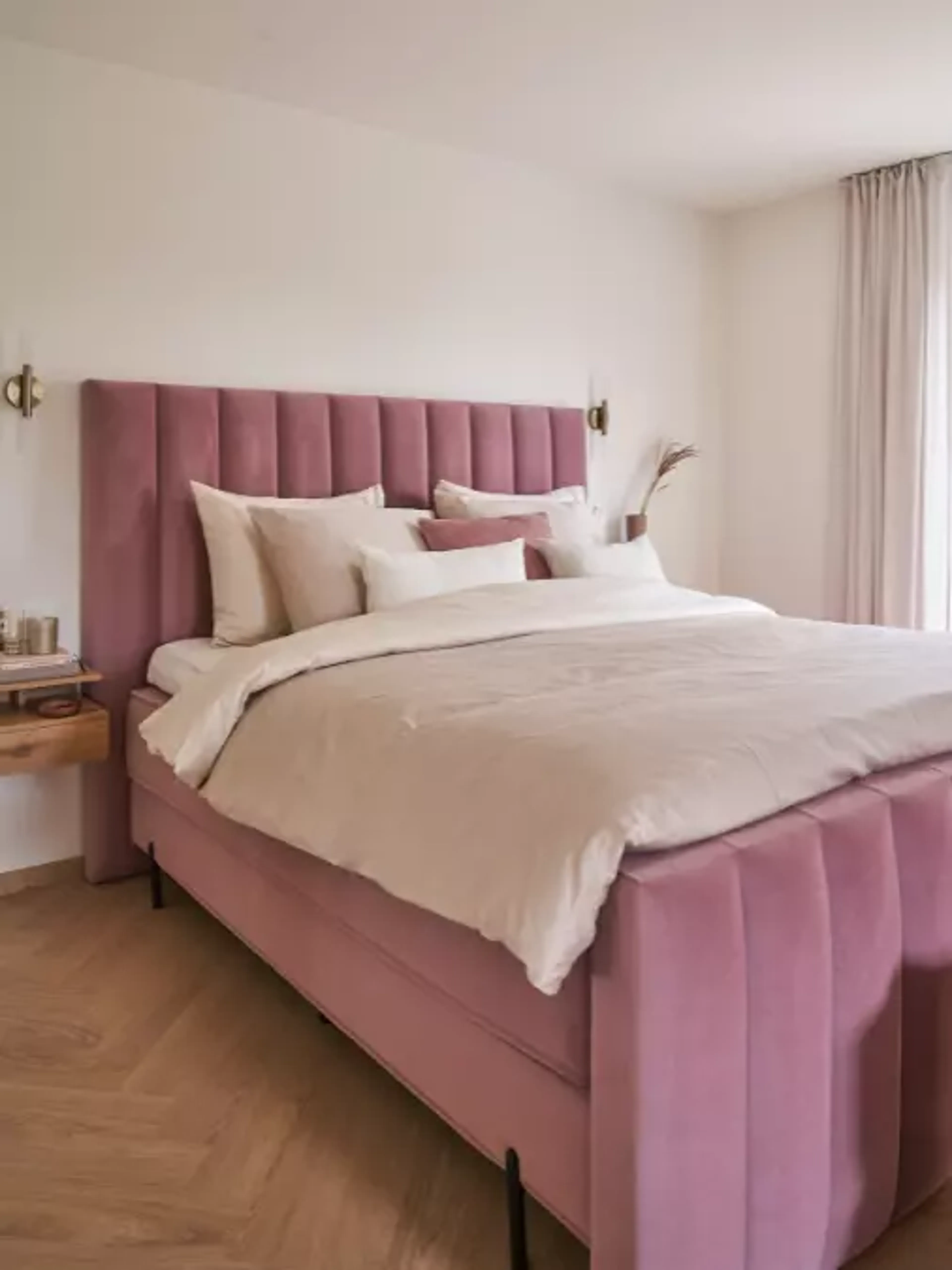 „Bei der Einrichtung unseres Schlafzimmers habe ich mich an meinem Lieblingshotelzimmer orientiert. Ich mag es, dass es jetzt sehr sauber und ruhig ist, mit so wenig Zeug wie möglich. Als wir umzogen, beschlossen wir, dass es Zeit für ein neues, zeitloses Bett war. Auch die Funktionalität ist uns wichtig. Der Stoff ist leicht sauber zu halten und die hohen Beine machen es uns einfacher, darunter zu saugen. Wir haben lange mit einem beigen Bett gezögert. Schließlich sind wir zu dem Schluss gekommen, dass ein neutraler Beige-Ton doch nicht ganz zu uns passt. Deswegen haben wir uns für eine mutige Farbe entschieden. Siegfried mag es nicht, wenn er viele Möglichkeiten hat. Also habe ich ihm 3 Betten zur Auswahl gegeben und er hat sich dann für das Boxspring Royal Metropolis in Rosa entschieden. Jetzt ist es wirklich ein Blickfang.”