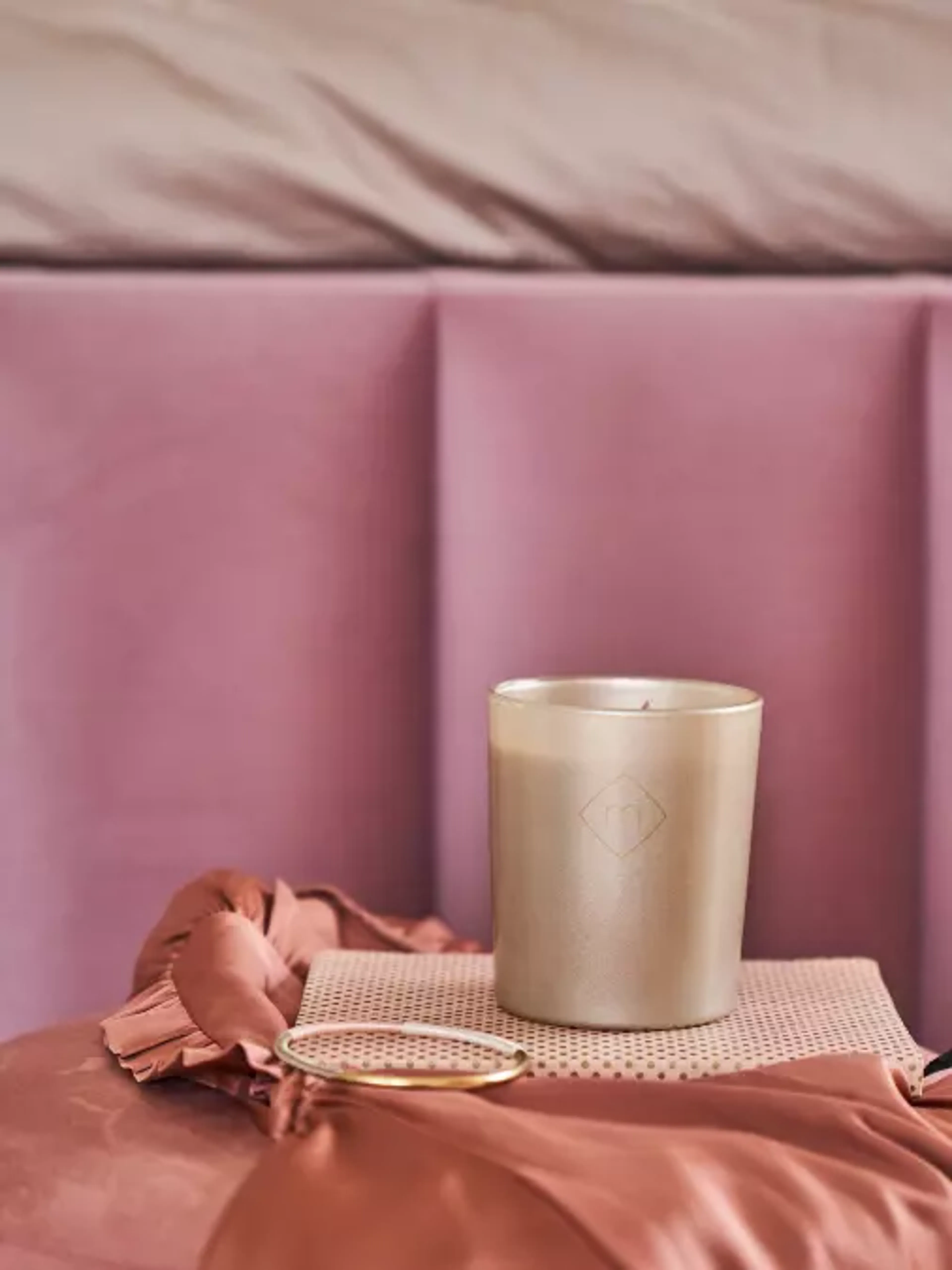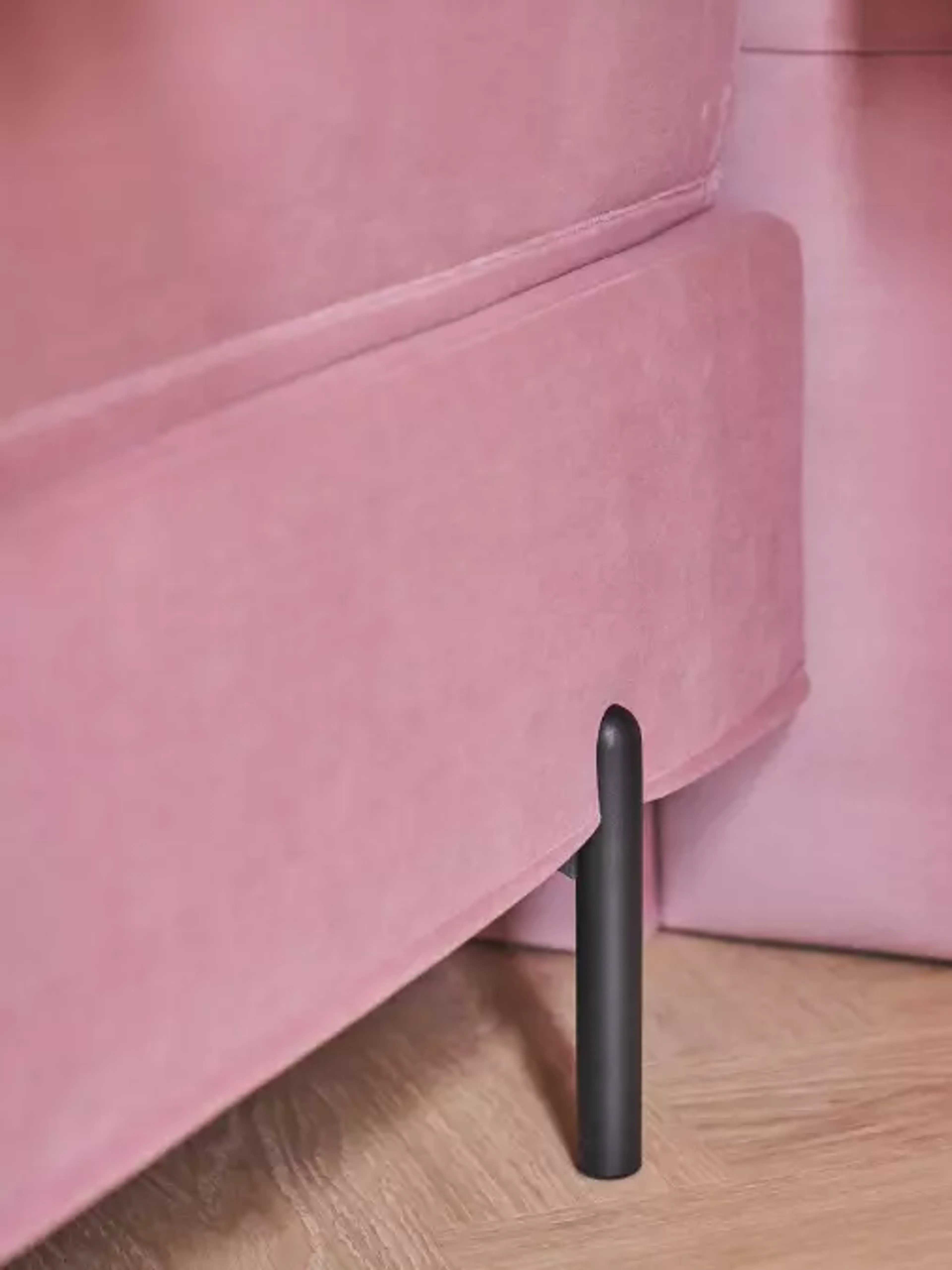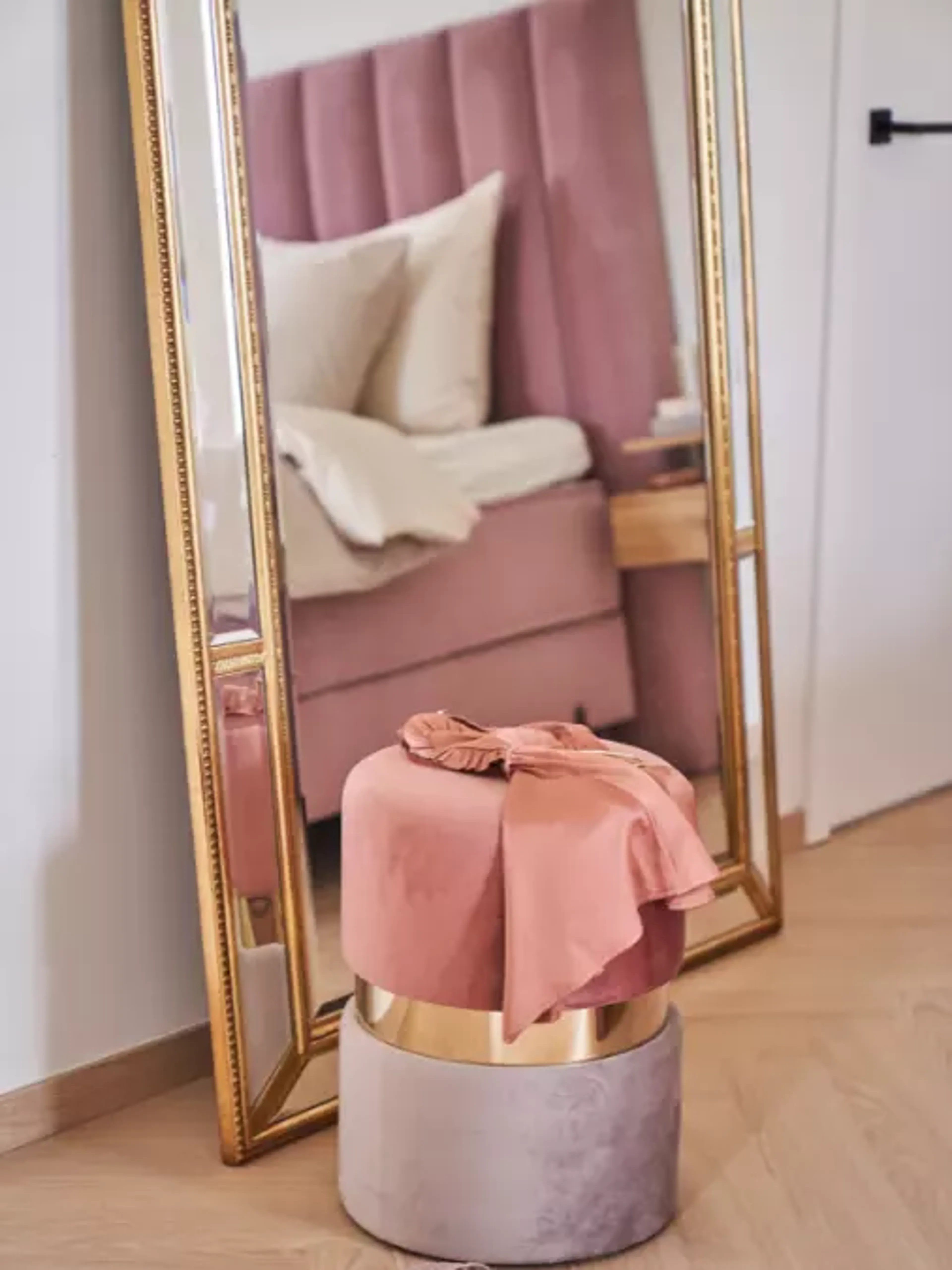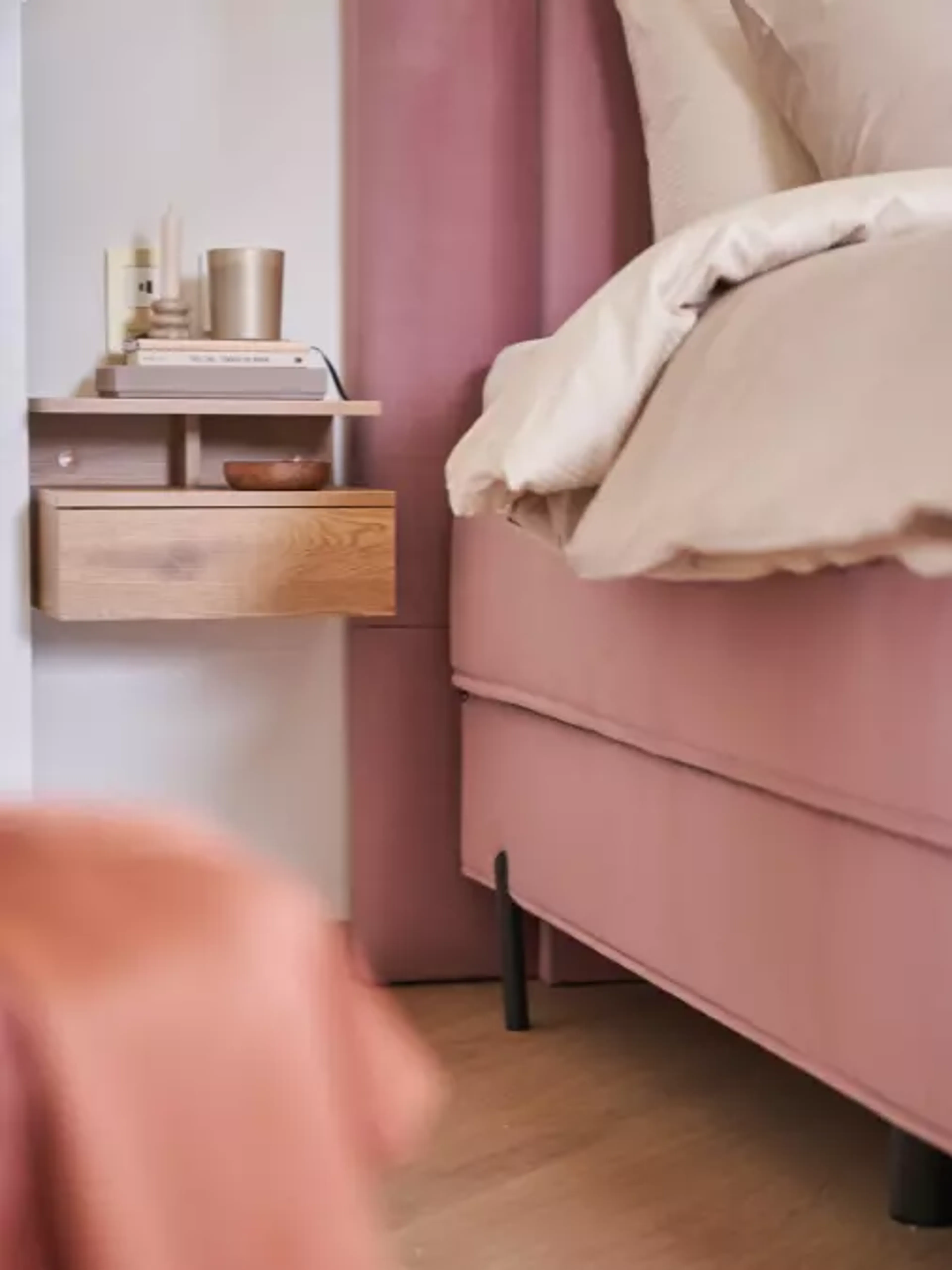 „Bei der Einrichtung unseres Schlafzimmers habe ich mich an meinem Lieblingshotelzimmer orientiert. Ich mag es, dass es jetzt sehr sauber und ruhig ist, mit so wenig Zeug wie möglich. Als wir umzogen, beschlossen wir, dass es Zeit für ein neues, zeitloses Bett war. Auch die Funktionalität ist uns wichtig. Der Stoff ist leicht sauber zu halten und die hohen Beine machen es uns einfacher, darunter zu saugen. Wir haben lange mit einem beigen Bett gezögert. Schließlich sind wir zu dem Schluss gekommen, dass ein neutraler Beige-Ton doch nicht ganz zu uns passt. Deswegen haben wir uns für eine mutige Farbe entschieden. Siegfried mag es nicht, wenn er viele Möglichkeiten hat. Also habe ich ihm 3 Betten zur Auswahl gegeben und er hat sich dann für das Boxspring Royal Metropolis in Rosa entschieden. Jetzt ist es wirklich ein Blickfang.”