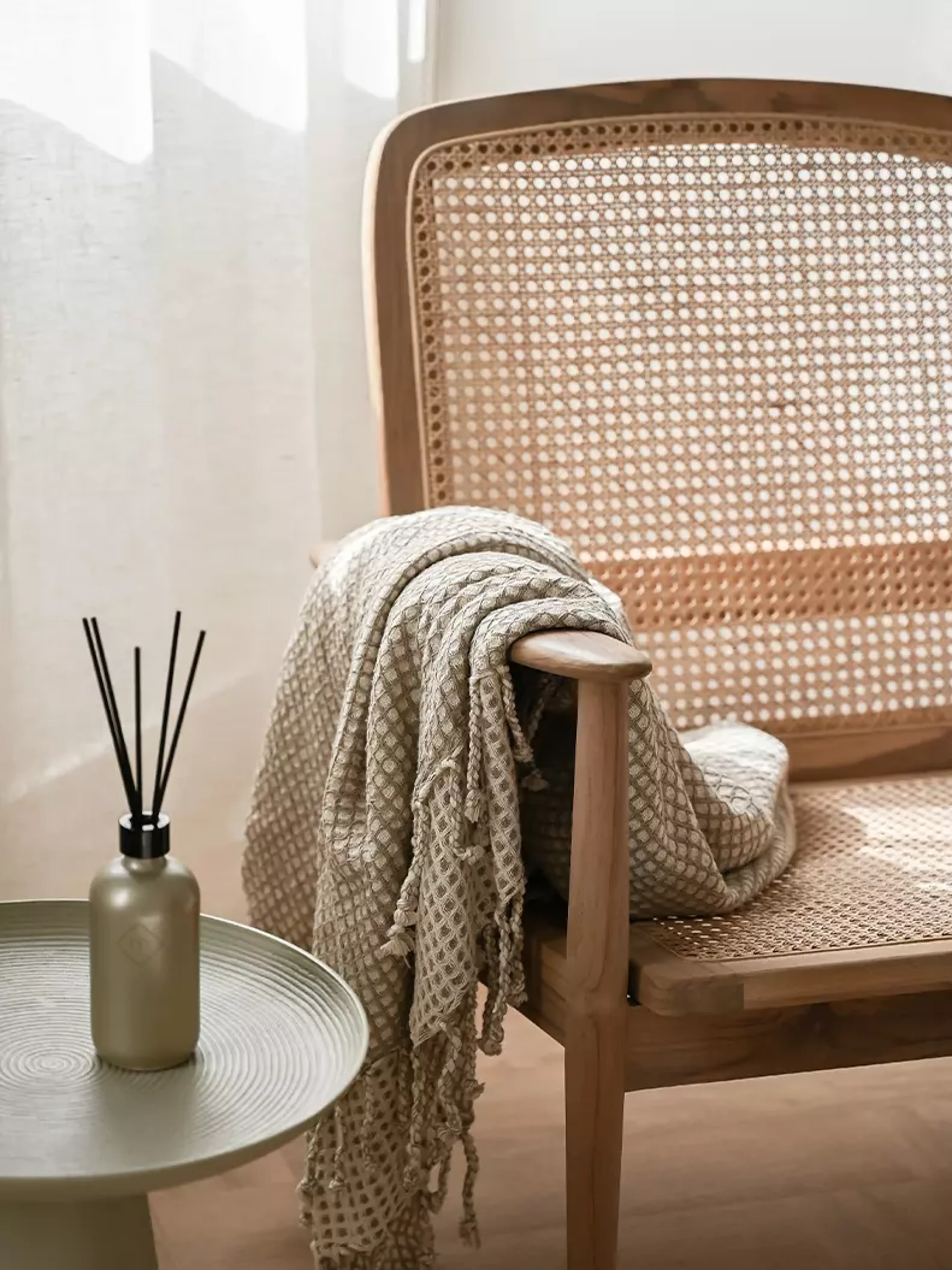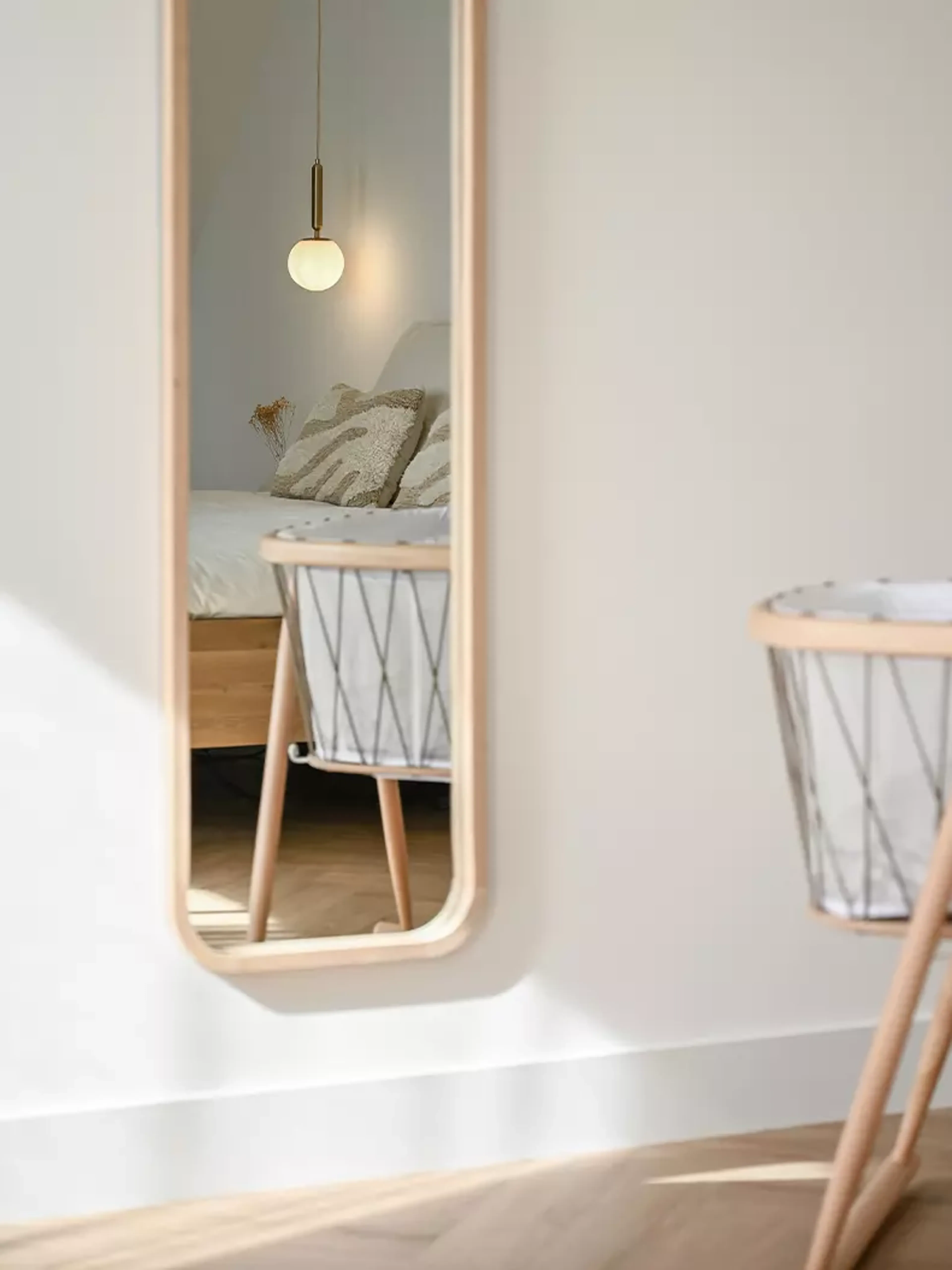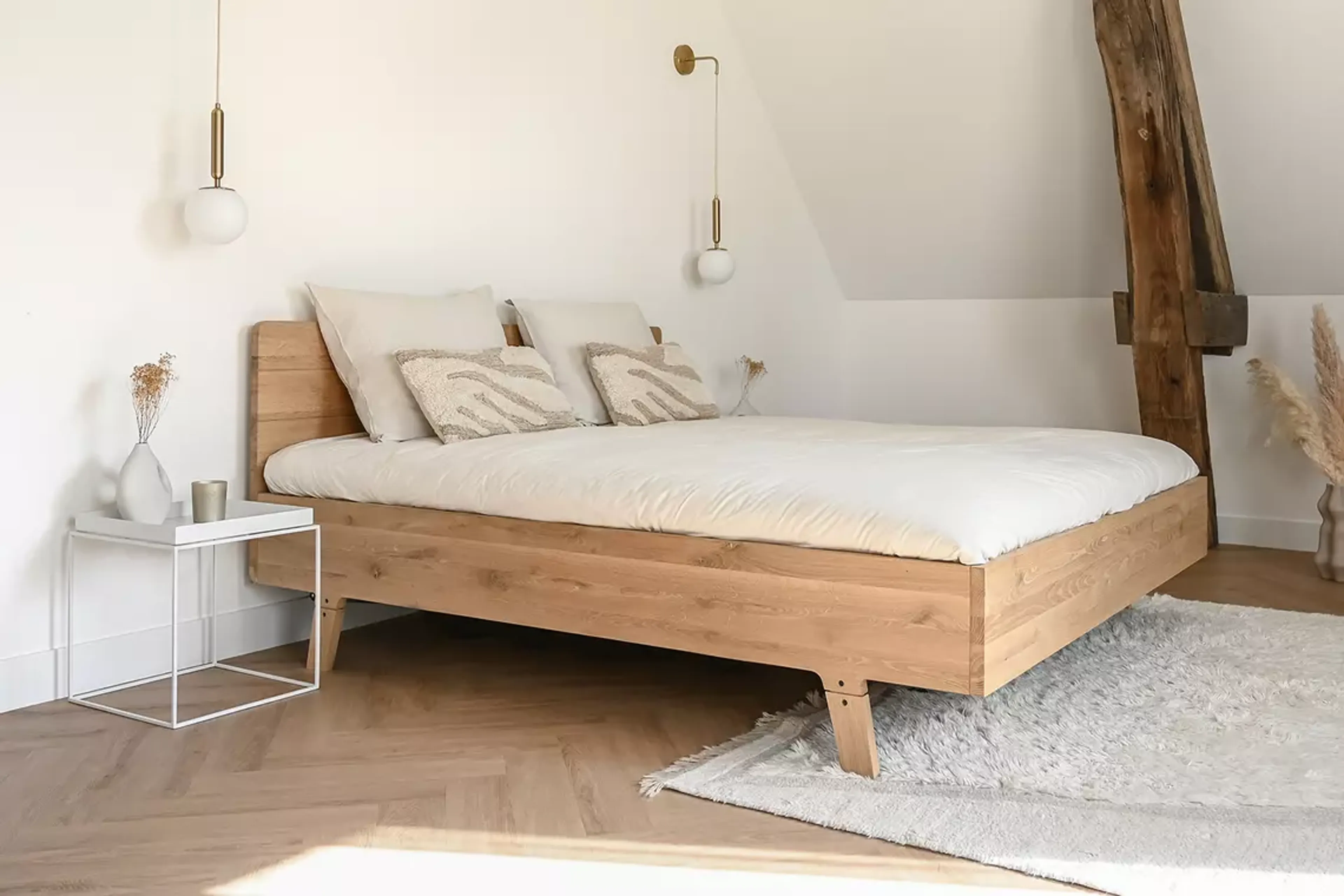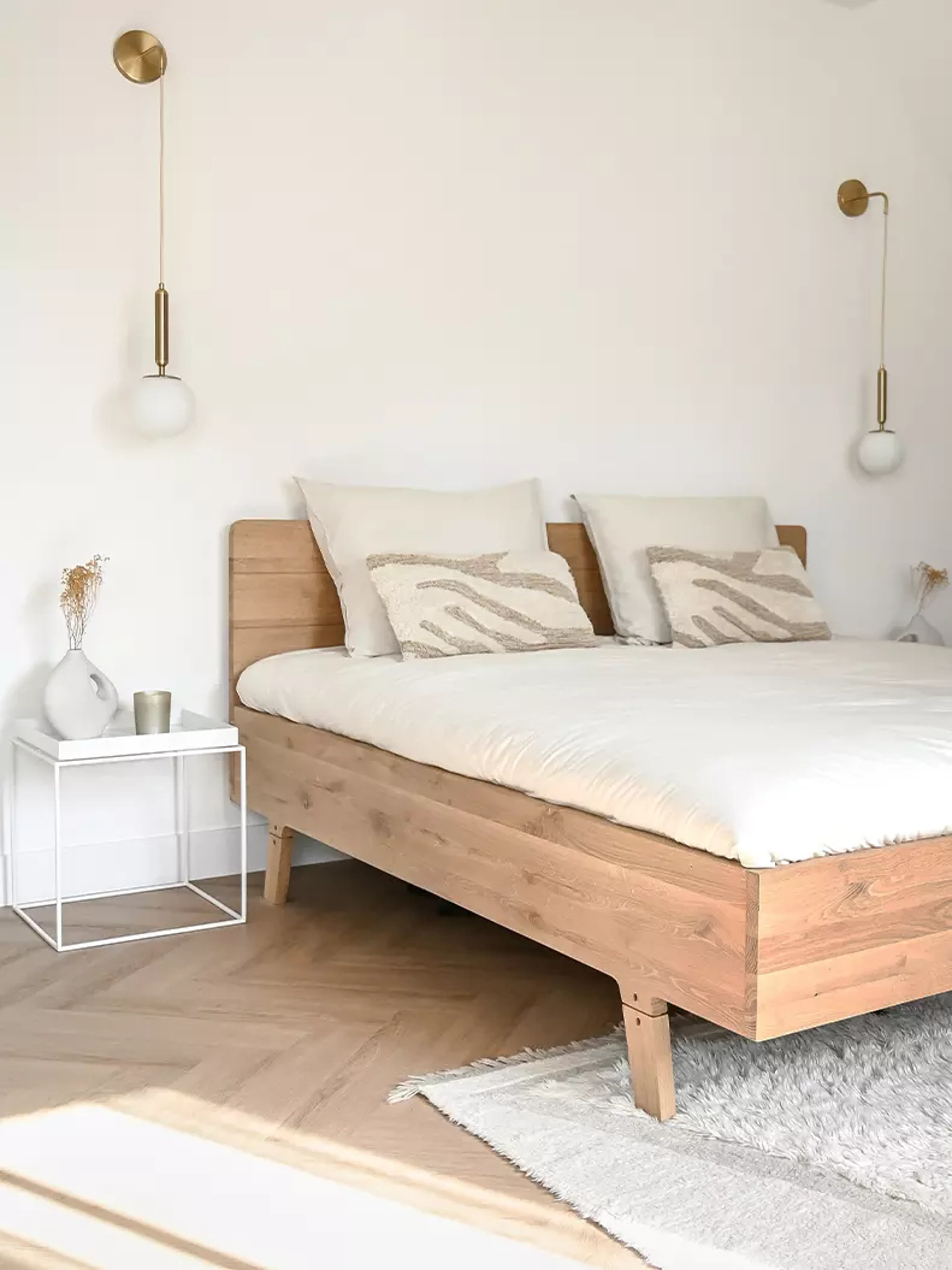 „Unser Schlafzimmer ist sehr geräumig.“ Ein großer Raum, hohe Decken – mit einem Holzbalken aus Friesland akzentuiert. „Daher ist uns die Aufmachung sehr wichtig. Wir verwendeten größtenteils natürliche Materialien, deswegen durfte auch ein Bett aus Holz nicht fehlen. Zusätzlich nutzen wir leichte Stoffe mit weicher Struktur wie die Leinenoptik des Bettbezugs und den Bouclé-Stoff der Zierkissen.“