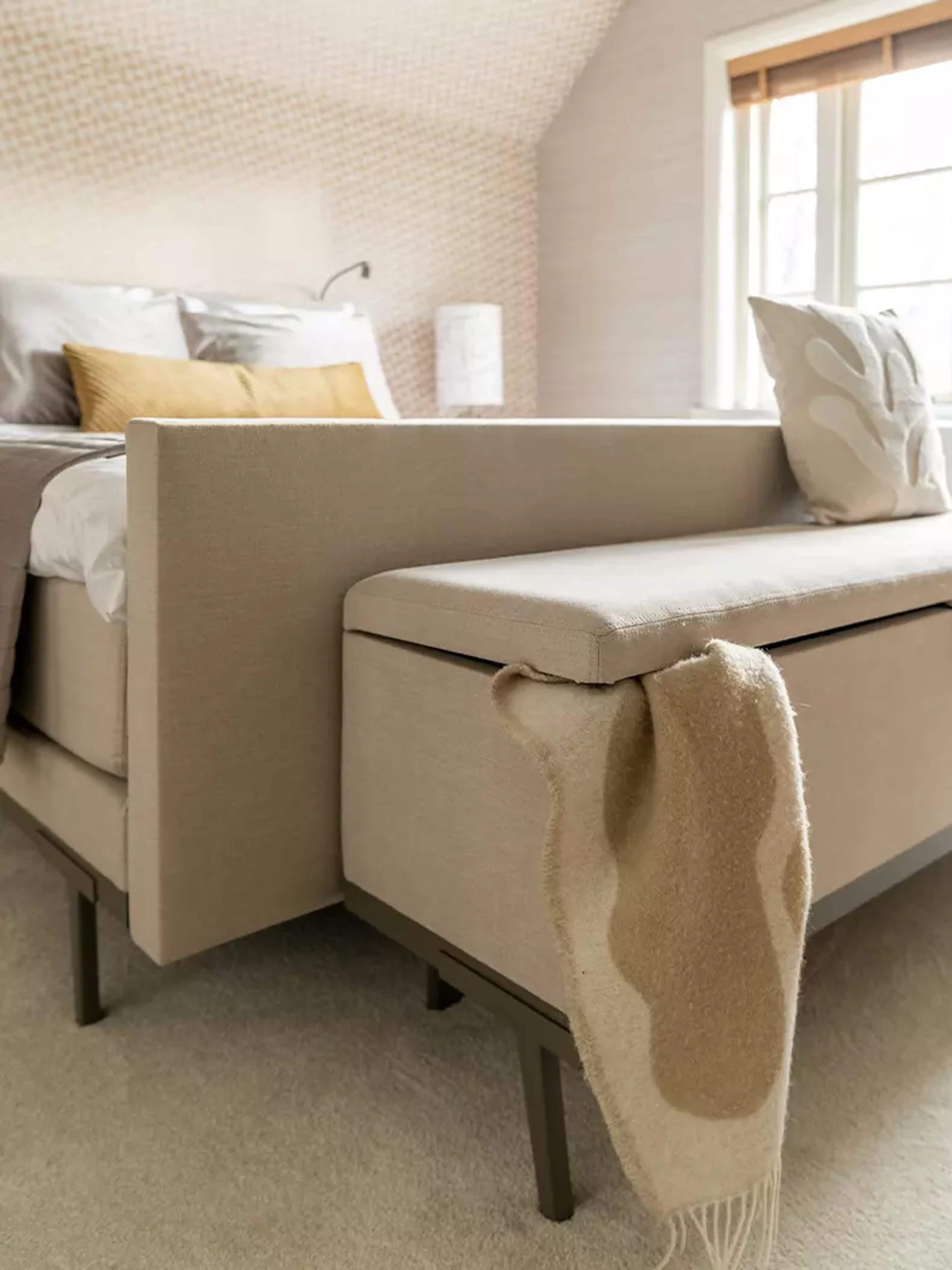 „Vor unserem aktuellen Bett hatten wir bereits ein Boxspringbett von Swiss Sense und waren von der Qualität immer begeistert. Nach elf Jahren musste dann aber ein Ersatz her.“ Michelle und Wyb entschieden sich mit dem Lifestyle Cinnamon für ein modernes Boxspringbett aus der Lifestyle-Kollektion. „Beratung, Lieferung und Aufbau waren tadellos. Wir entschieden uns für den champagnerfarbenen Stoff, da dieser perfekt zur Bettbank und den Nachttischen passt. Die Bettbank ist einfach genial – praktisch und schick.“