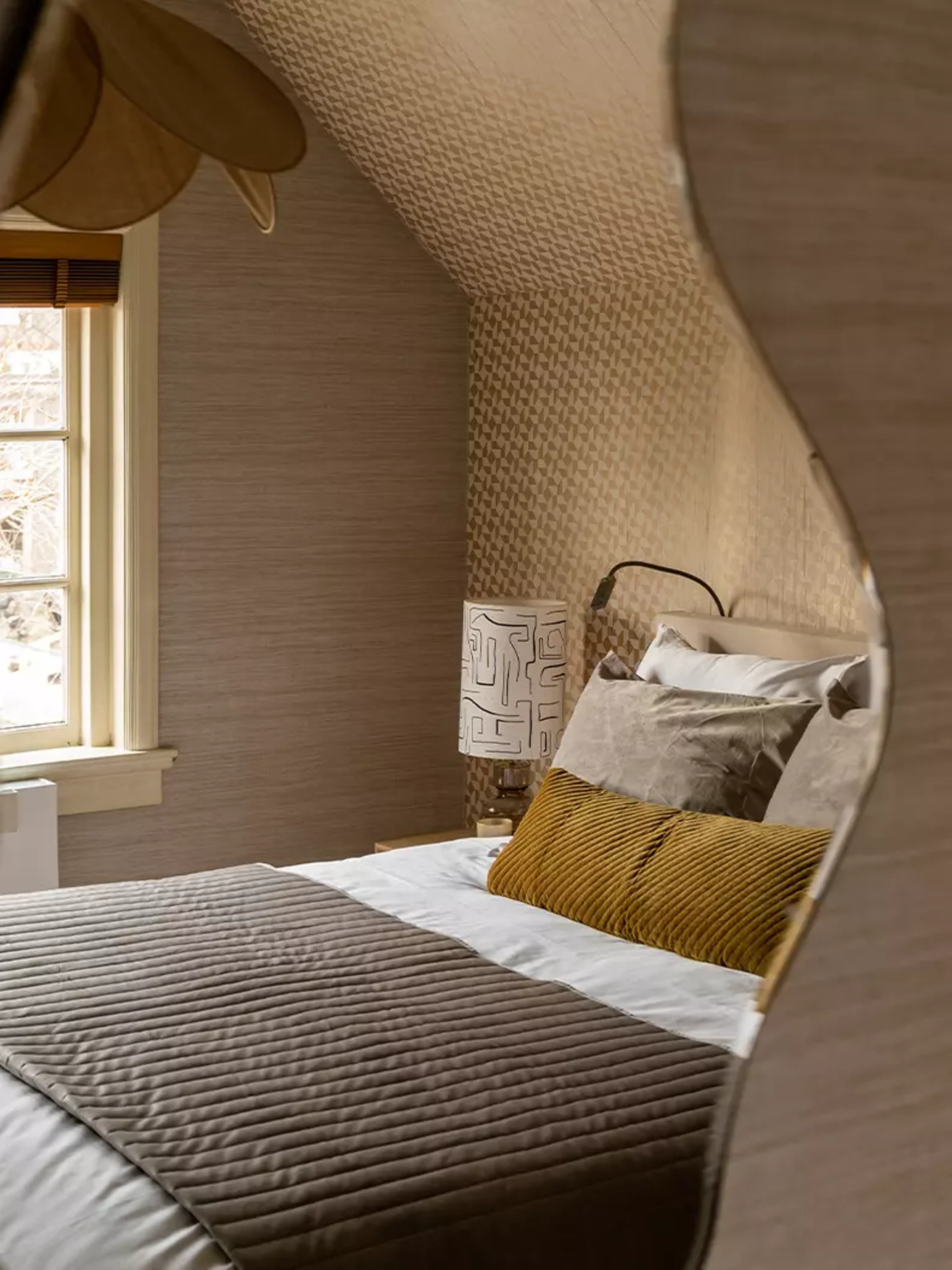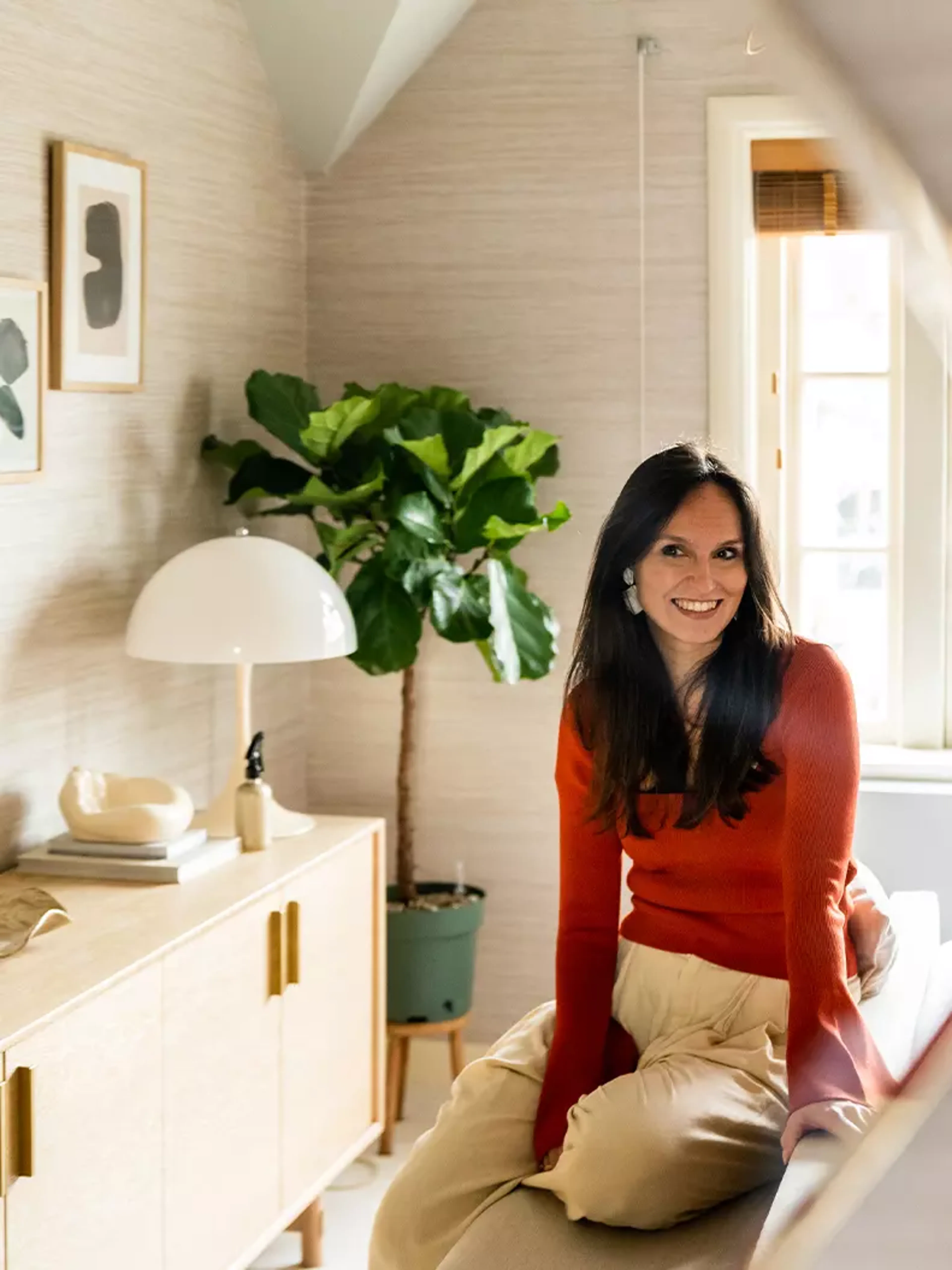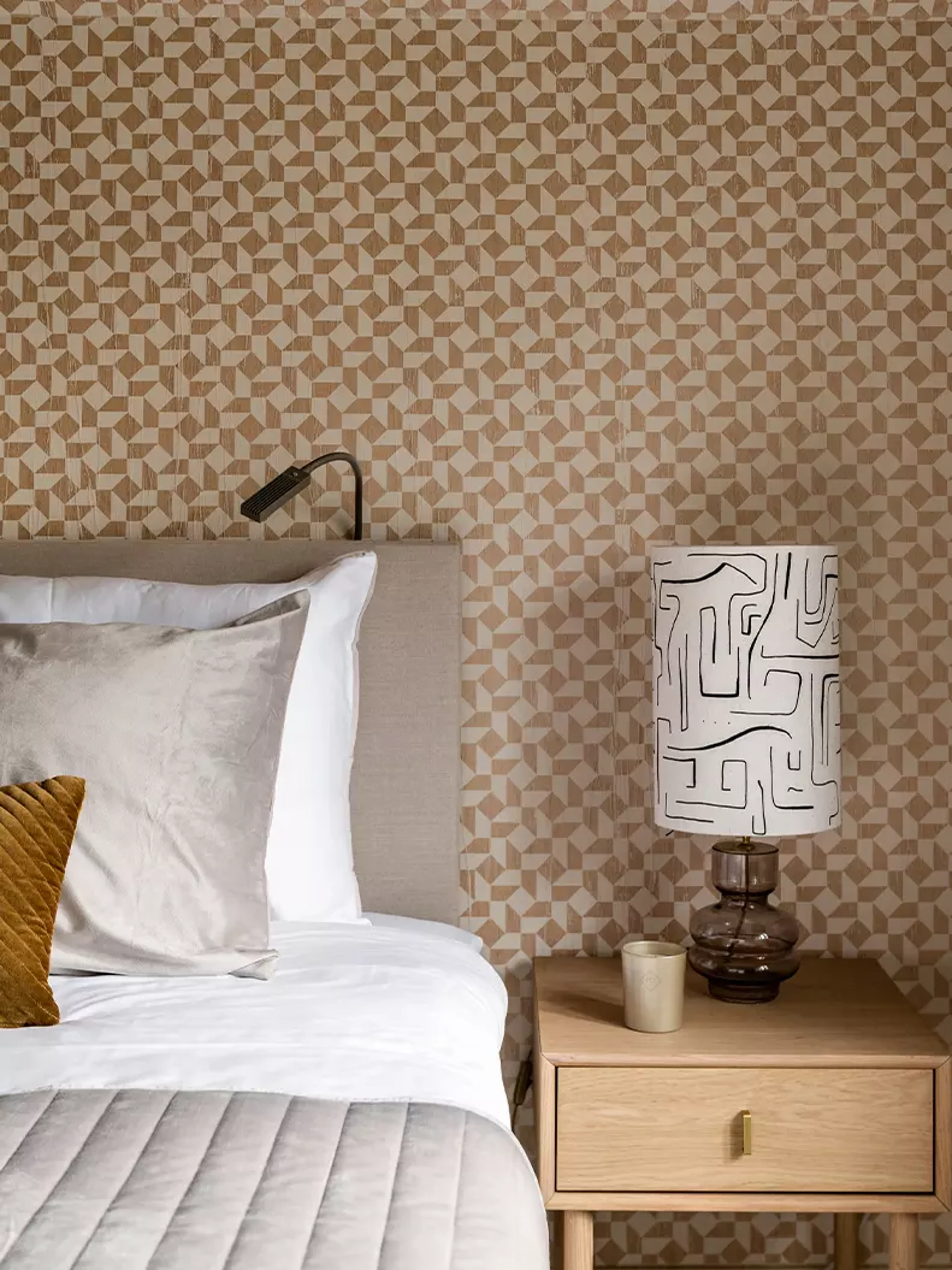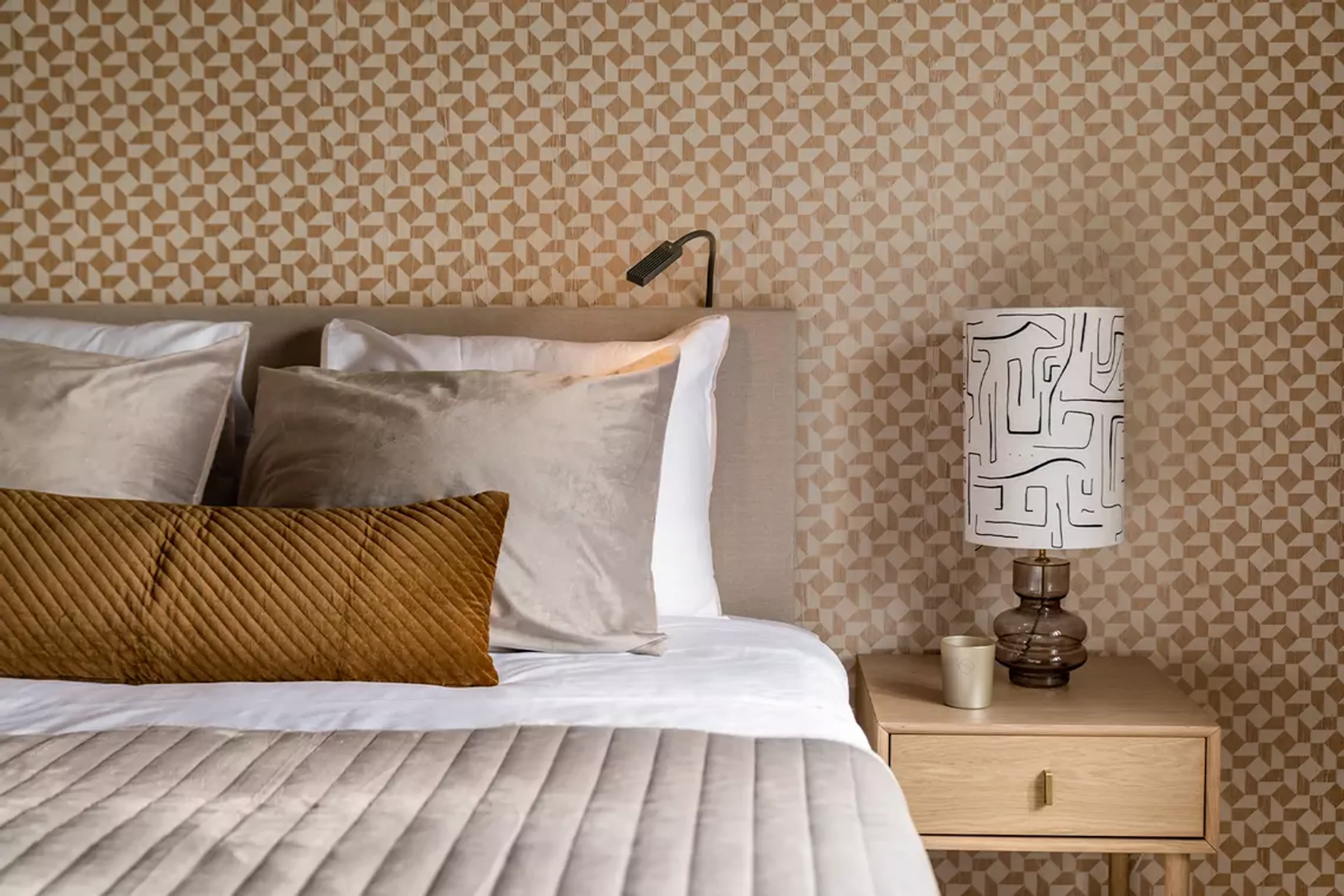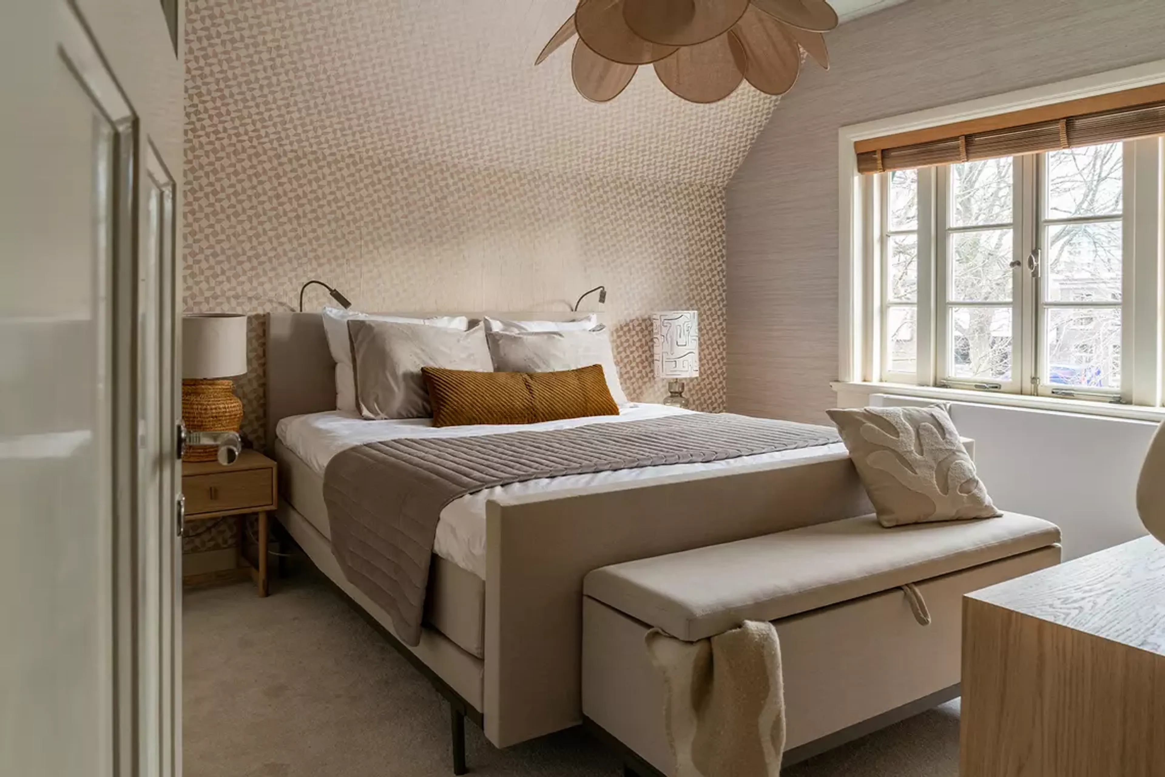 „Bei der Inneneinrichtung legten wir besonderen Wert auf helle, erdige Farben, die wir mit warmen Elementen wie Holz und Pflanzen akzentuierten. Denn für mich ist das Schlafzimmer ein Ort zum Auftanken. Die Highlights sind der weiche Teppich und die auffällige Tapete, in die ich mich auf den ersten Blick verliebt habe.“