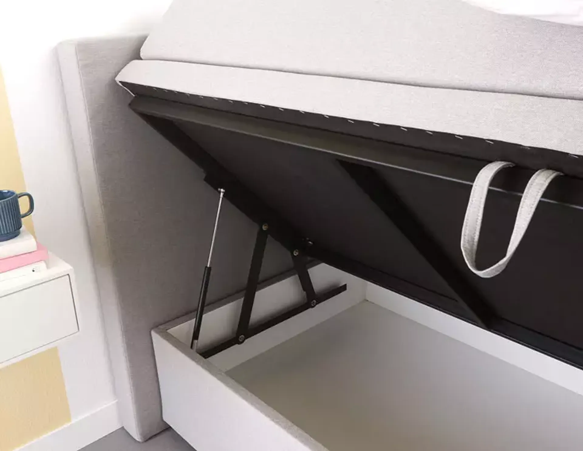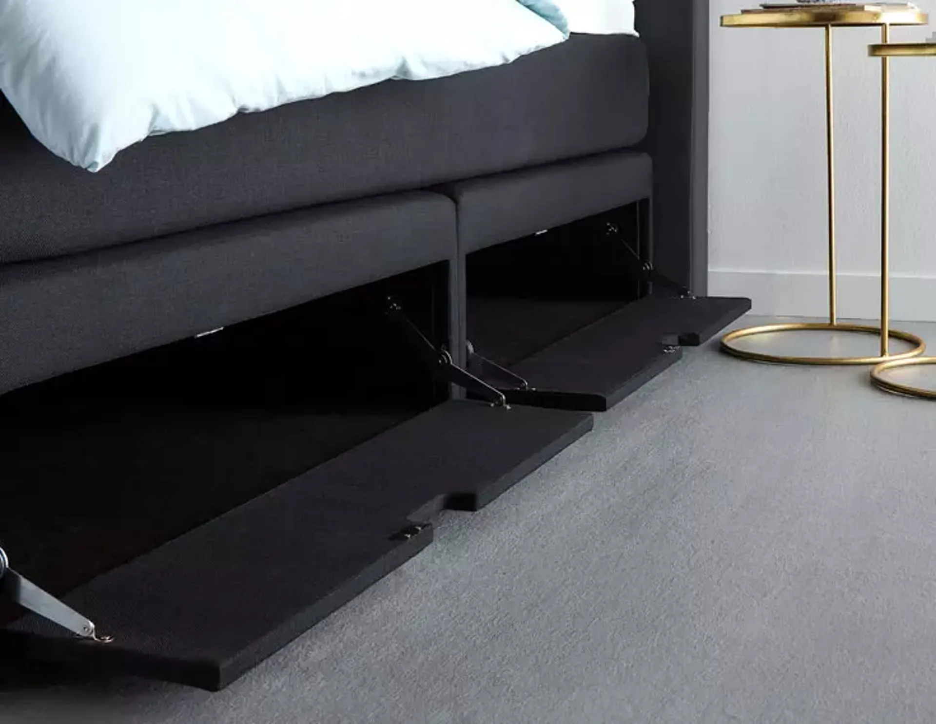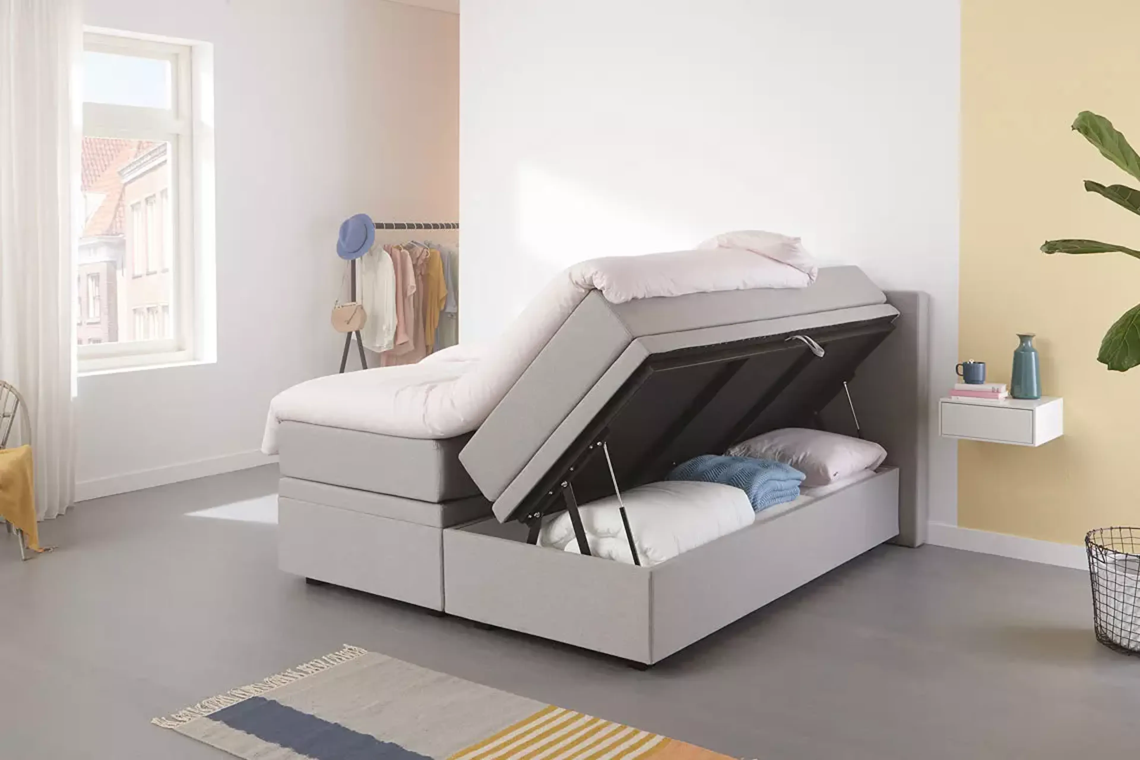 Vor allem in kleinen Schlafzimmern fehlt es schnell an Stauraum. Deshalb haben wir verschiedene Boxspringbetten mit praktischem Stauraum in unserer Kollektion. Beim Boxspringbett SMART 02 öffnet man den Stauraum unter der gesamten Liegefläche ganz einfach mit einer Schlaufe auf der Seite des Bettes. Hier bewahren Sie mühelos Kleider, Bettdecken, Kissen und noch vieles mehr staubfrei auf.