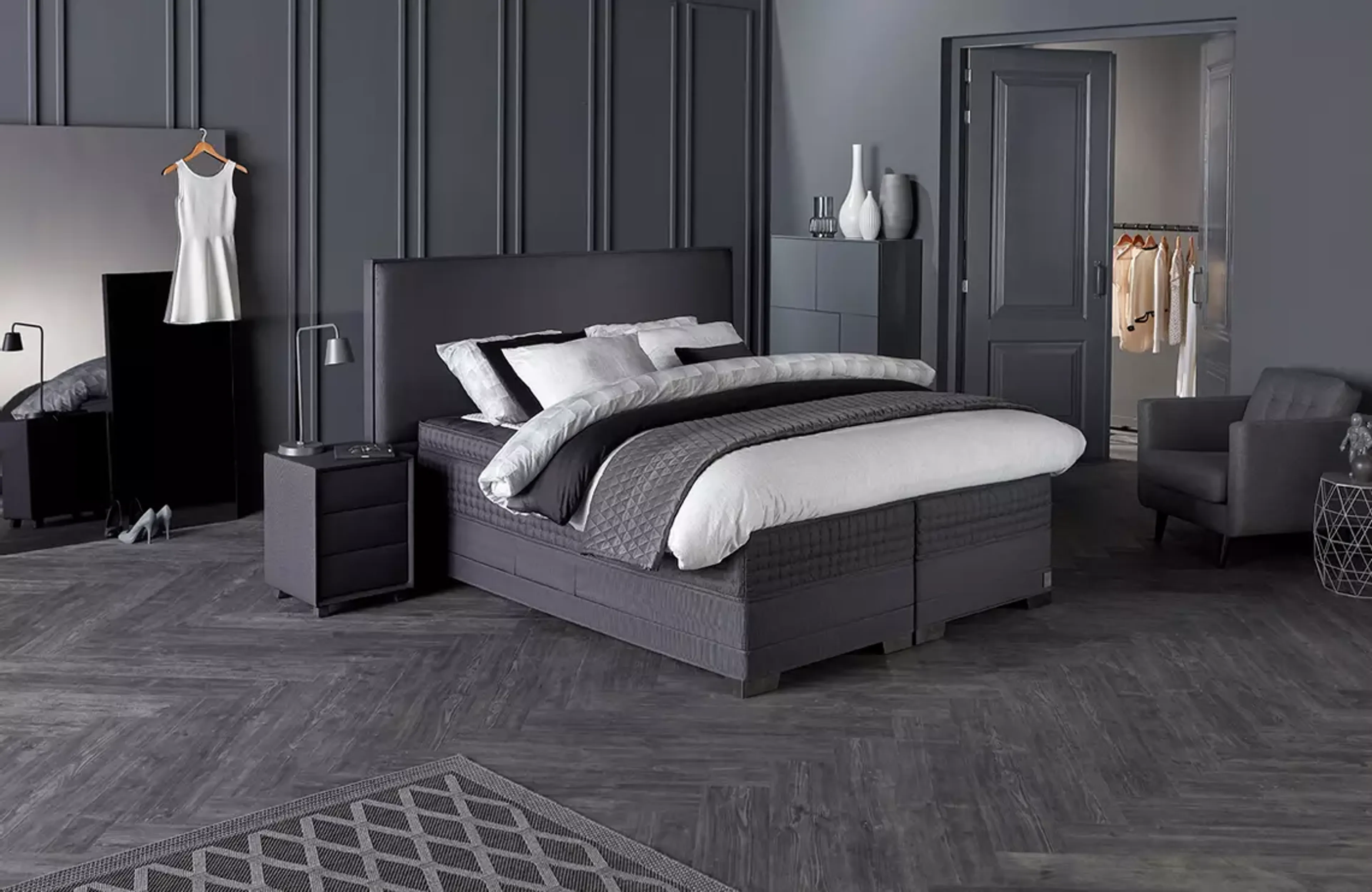 Auch im Styling von Jubiläums-Boxspringbett Edition III haben wir verschiedene Grautöne verwendet. Die klassische Basis in diesem Schlafzimmer enthält viele Grautöne, welche durch moderne Elemente ergänzt werden. Dunkel, viel und gewagt, aber versuchen Sie es einfach mal! Eine Wand streichen dauert nicht lange, sorgt aber für einen komplett neuen Look. Außerdem können Sie die Wand auch schnell wieder neu streichen wenn Ihnen die Farbe doch nicht gefällt.