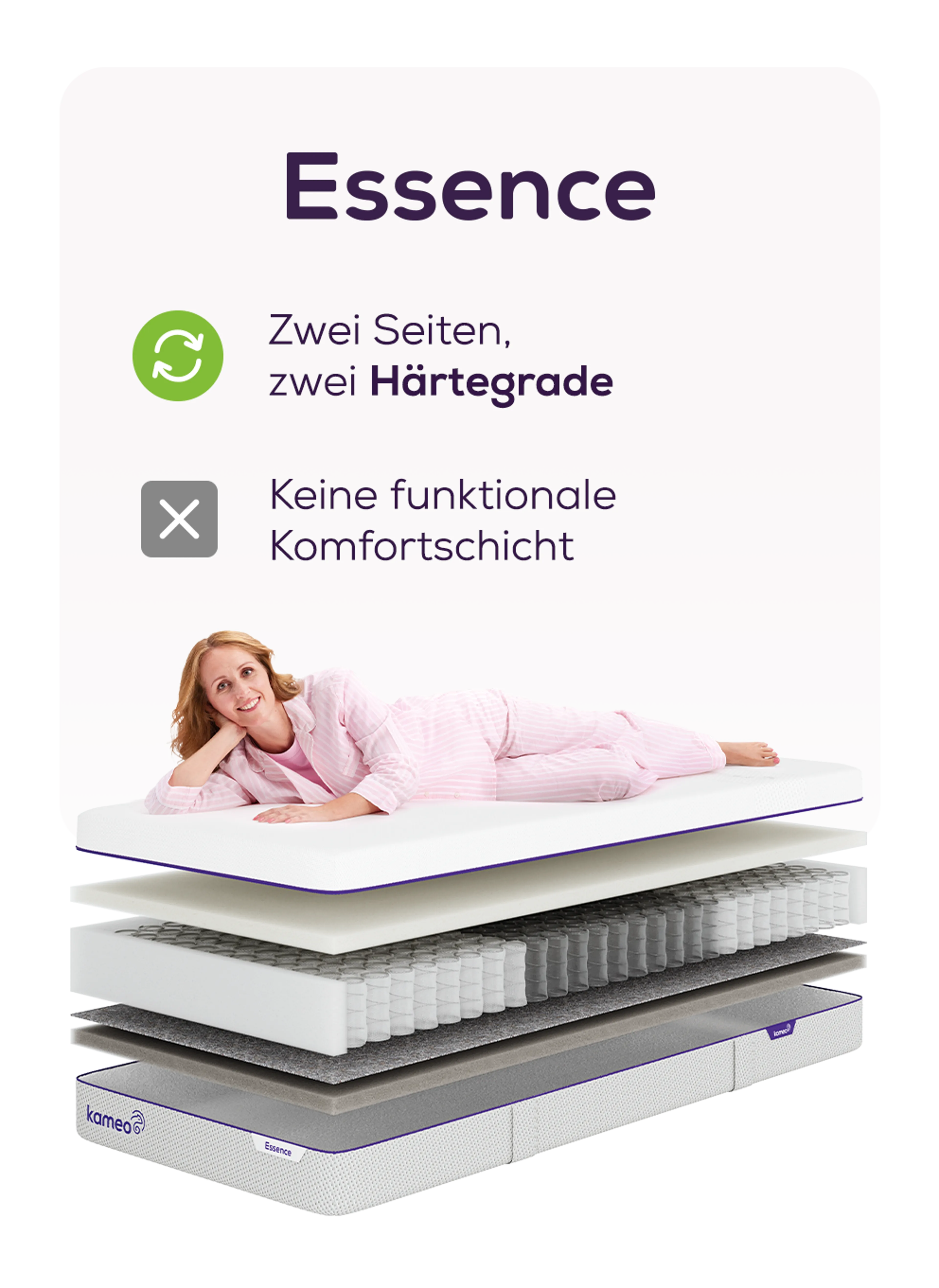Der richtige Härtegrad der Matratze hängt von Ihrem Körpergewicht und Ihren persönlichen Vorlieben ab. Die KAMEO Matratze ist eine Wendematratze und hat zwei Seiten mit verschiedenen Härtegraden:
