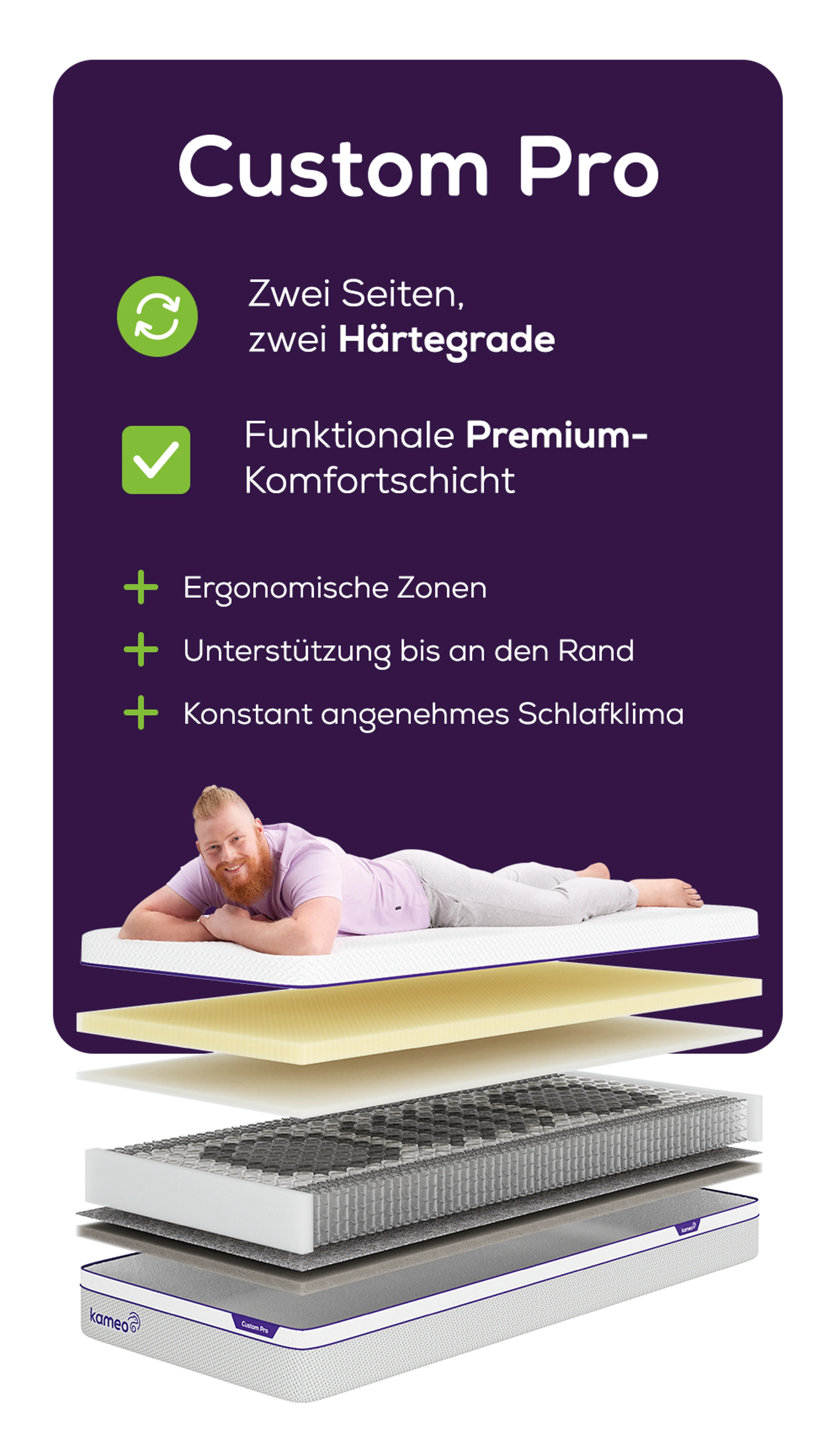 Die KAMEO Custom bringt Unterstützung auf das nächste Level. Mit ihrem fortschrittlichen 5-Zonen-Taschenfederkern ist die Matratze darauf ausgelegt, Ihren Körper optimal zu unterstützen und Druckpunkte zu entlasten. Egal ob Sie auf dem Rücken, der Seite oder dem Bauch schlafen.