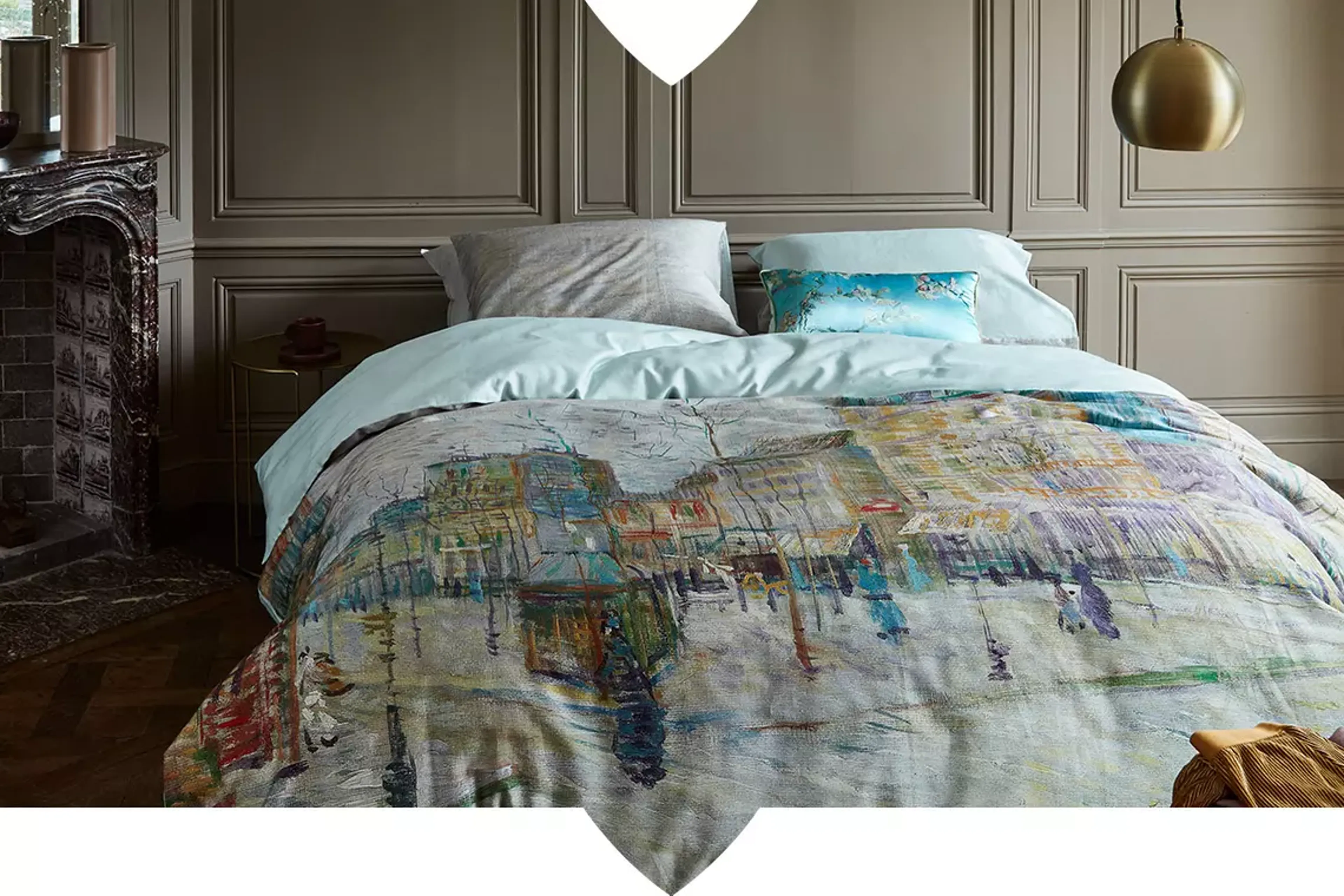 Die Bettwäsche „Boulevard Grey“ besticht durch ihre hellen Pastellfarben. Das Bild zeigt den Boulevard de Clichy, eine der wichtigsten Straßen im Pariser Künstlerviertel Montmartre. Van Gogh malte die Kreuzung, die er oft überquerte. Rechts, außerhalb des Bildes, beginnt die Rue Lepic, wo Vincent mit seinem Bruder Theo wohnte.