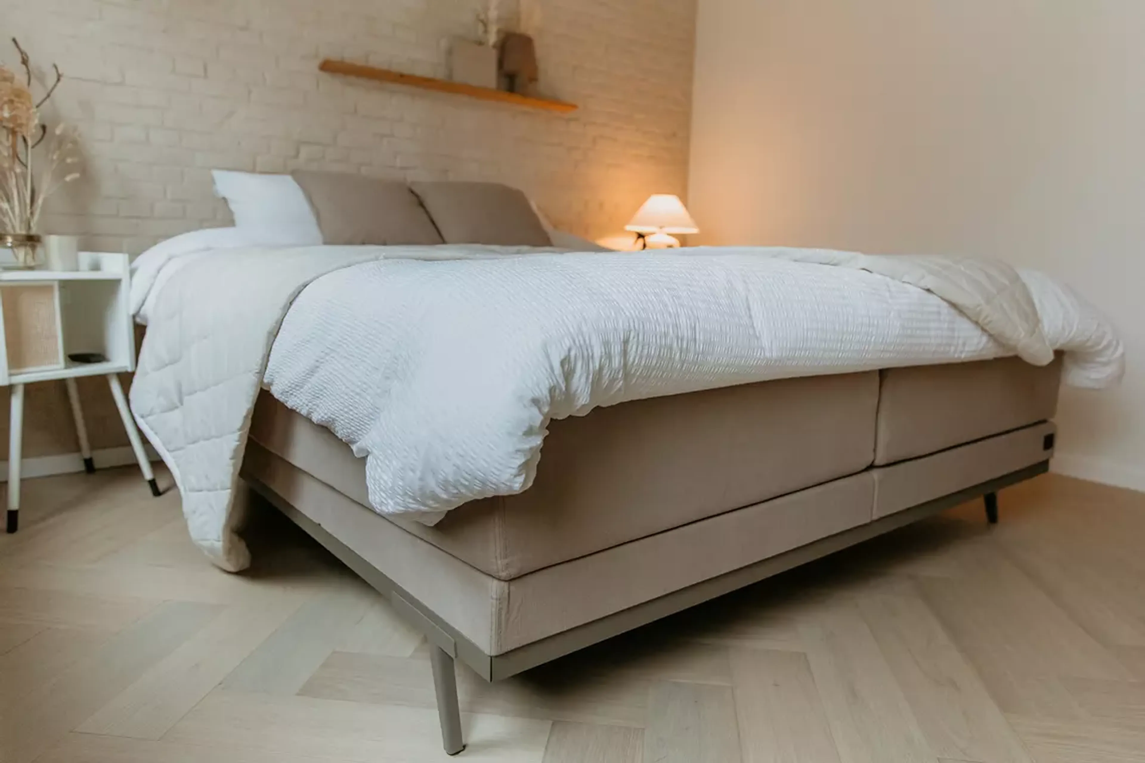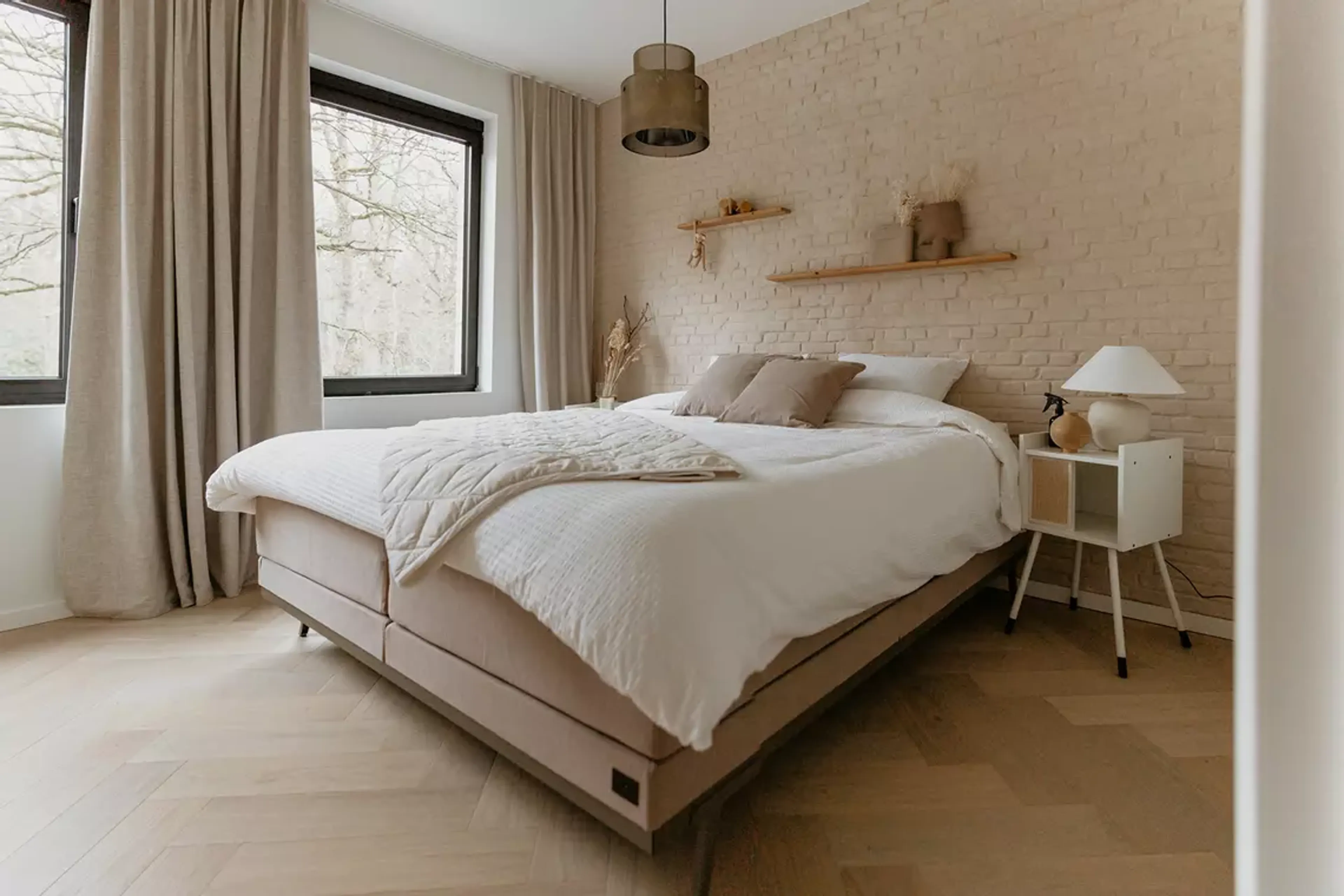 "Beim Betreten des Schlafzimmers fällt der Blick zunächst immer auf das Bett – da kannst du jeden fragen. Daher stellen Bett und Bettzeug den Mittelpunkt des Raums dar. Als wir bei der Suche nach einem neuen Bett das Boxspringbett Lifestyle Cinnamon sahen, war direkt klar, dass dies unser neues Bett werden wird. Mich überzeugte das zeitlose Design, der champagnerfarbene Stahlrahmen, der sanfte Stoff – einfach alles. Und wir entschieden uns bewusst gegen ein Kopfteil, um die Backsteinwand nicht zu verdecken."