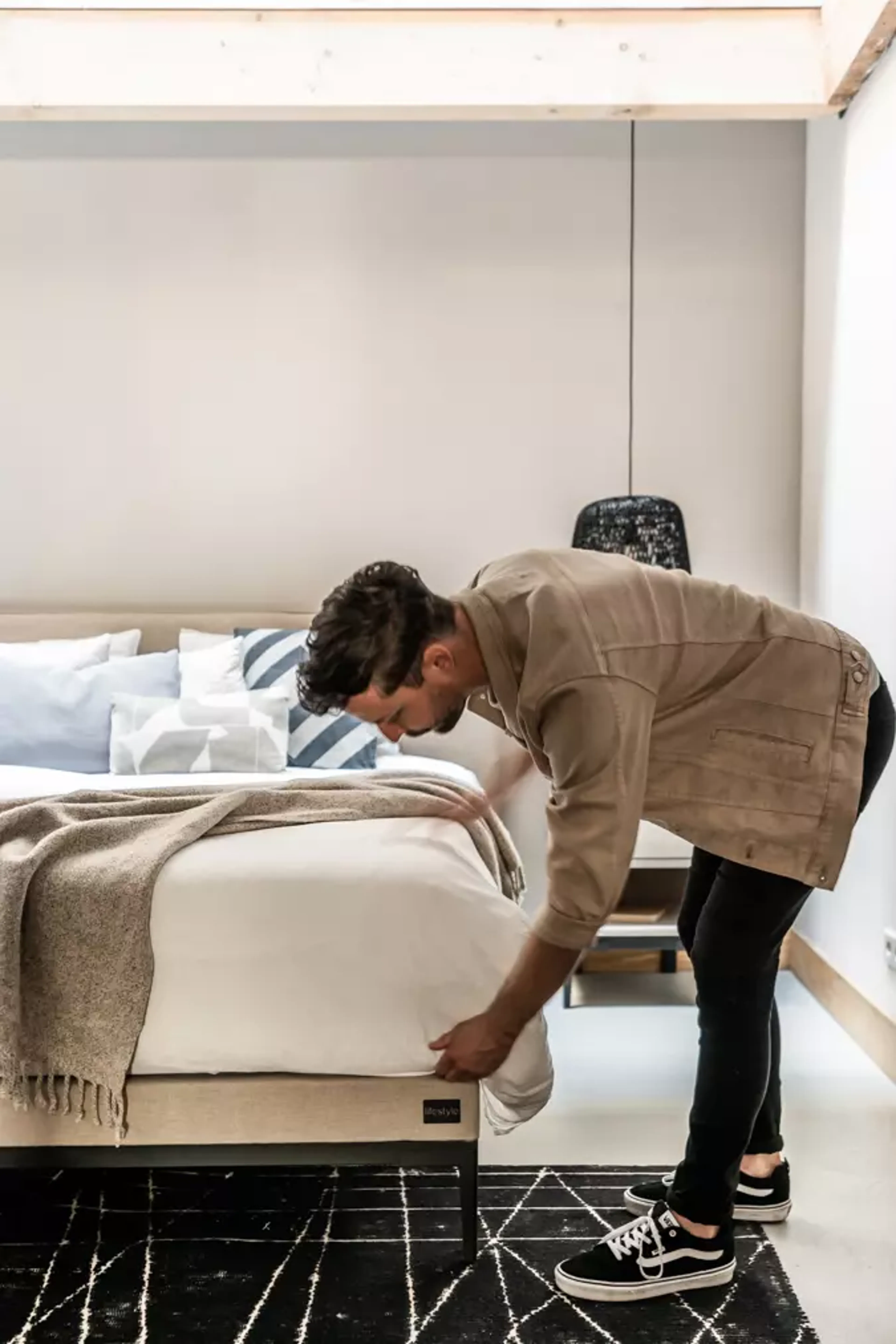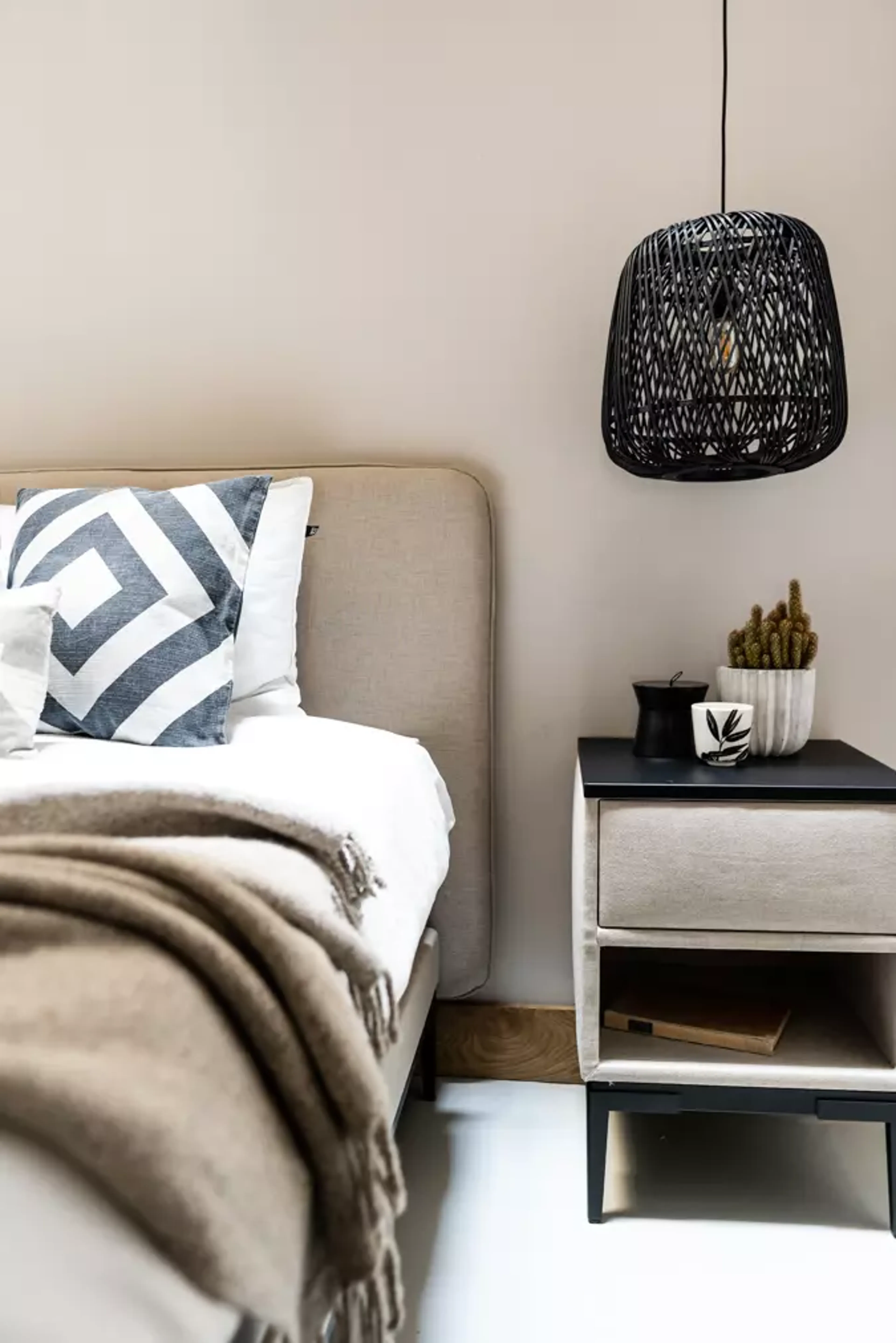 „Neben einem schönen Bett sind für mich viele dekorative Kissen und Plaids unverzichtbar. Sie verleihen dem Zimmer diese weiche, warme Ausstrahlung, die zu dem typischen Boutique-Hotel-Gefühl passt. Ich stecke den Bettbezug nicht ein, sondern lasse ihn für einen lässigen Look über das Fußende des Bettes hängen. Auf dem Nachttisch befindet sich ein Aufbewahrungsgefäß für Dinge, die ich oft benutze, aber nicht herumliegen lassen möchte, wie Ohrstöpsel und meine Uhr. Natürlich ist in einem Boutique-Hotel ein angenehmer Duft ein Muss. Und das Beste: Die Duftstäbchen oder Duftkerzen sorgen nicht nur für eine ganz eigene Atmosphäre, sondern sehen auch auf dem Nachttisch toll aus."